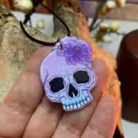 Lindíssimo pingente em resina acrílica, double side, representando crânio em tons violáceos com cordão sintético encerado.