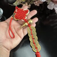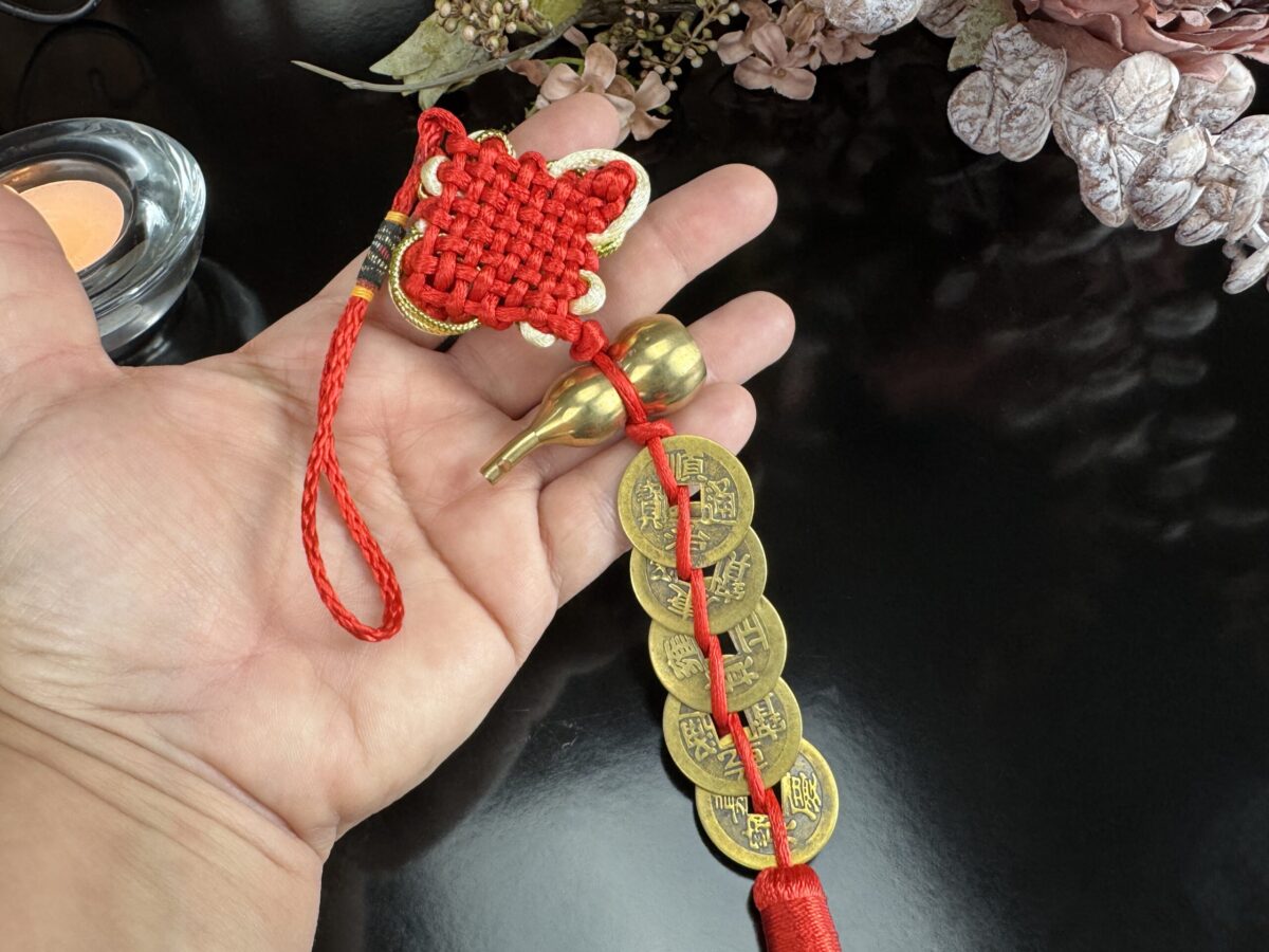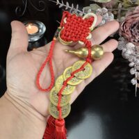 Este poderoso talismã combina três símbolos tradicionais da cultura chinesa: o nó místico vermelho, as moedas antigas da dinastia Qing e o Wu Lou (cabaça sagrada), formando um amuleto completo para atrair sorte, saúde e riqueza.