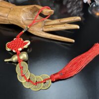 Material: Latão, cordão vermelho trançado e réplicas de moedas chinesas tradicionais