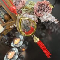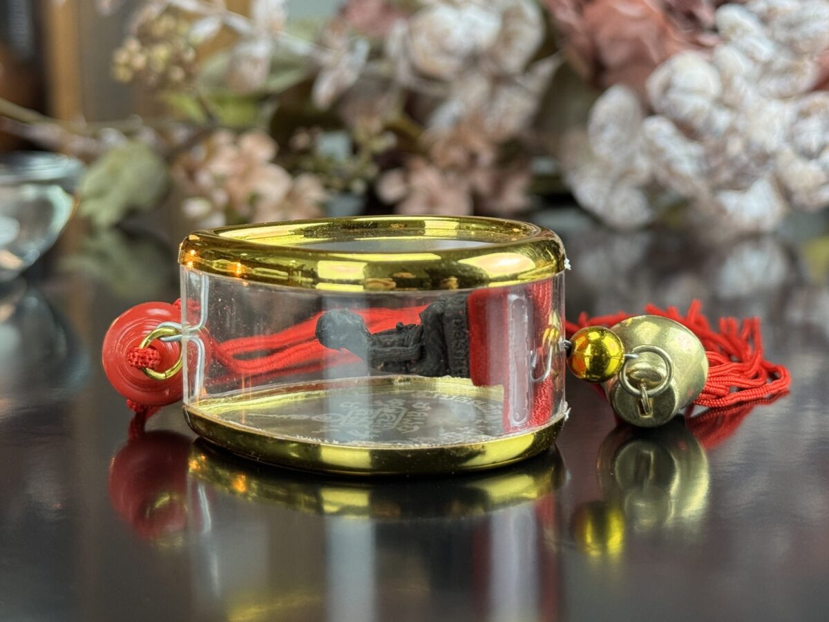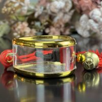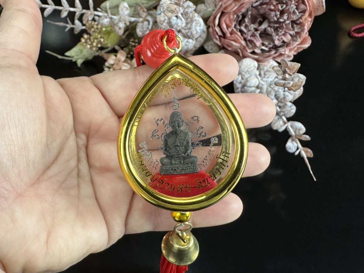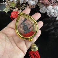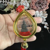 Dentro da cápsula em formato de gota, encontra-se uma imagem do Buda sobre base vermelha, cercada por inscrições místicas em tailandês, protegida por estrutura de acrílico com bordas douradas. A peça é finalizada com sininho ritual e cordão vermelho, ideal para pendurar em espaços de proteção ou usar como talismã pessoal.
