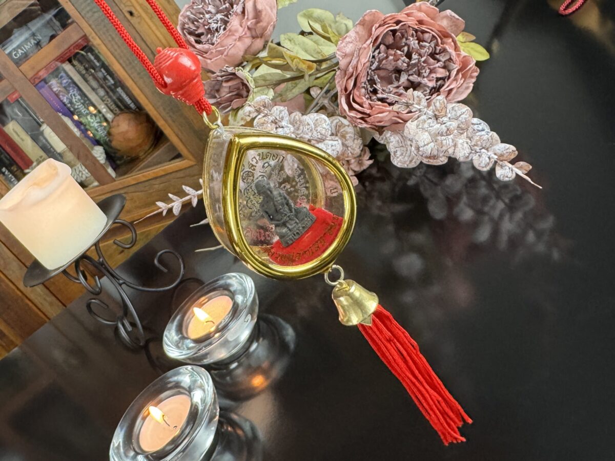 Este amuleto foi consagrado no templo Wat Suan Dok (Chiang Mai, Tailândia), um dos centros espirituais mais importantes do norte tailandês, associado à tradição Theravāda e à linhagem de monges da Floresta.