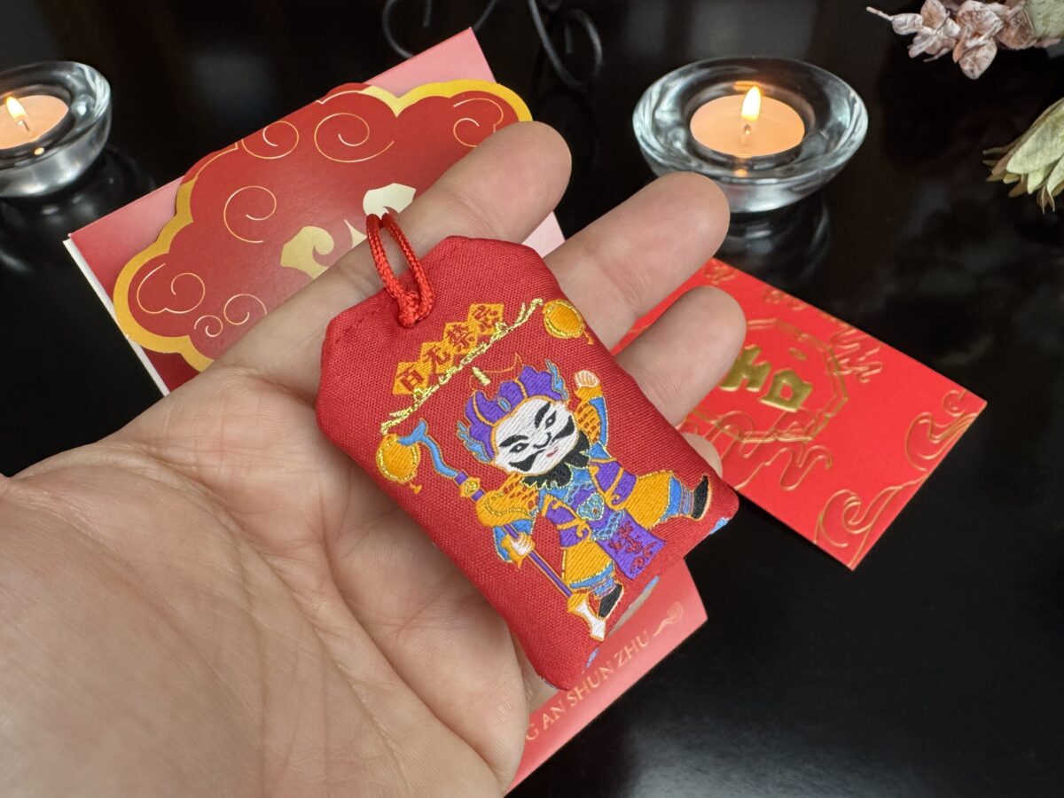 Este amuleto cerimonial foi adquirido no tradicional Templo Liurong, na China, conhecido por seus rituais devocionais voltados à longevidade, proteção e paz interior. Bordado em tecido vermelho auspicioso, ele traz inscrições que invocam a “paz duradoura” (平安) e a presença protetora de uma divindade guerreira tradicional.