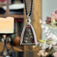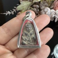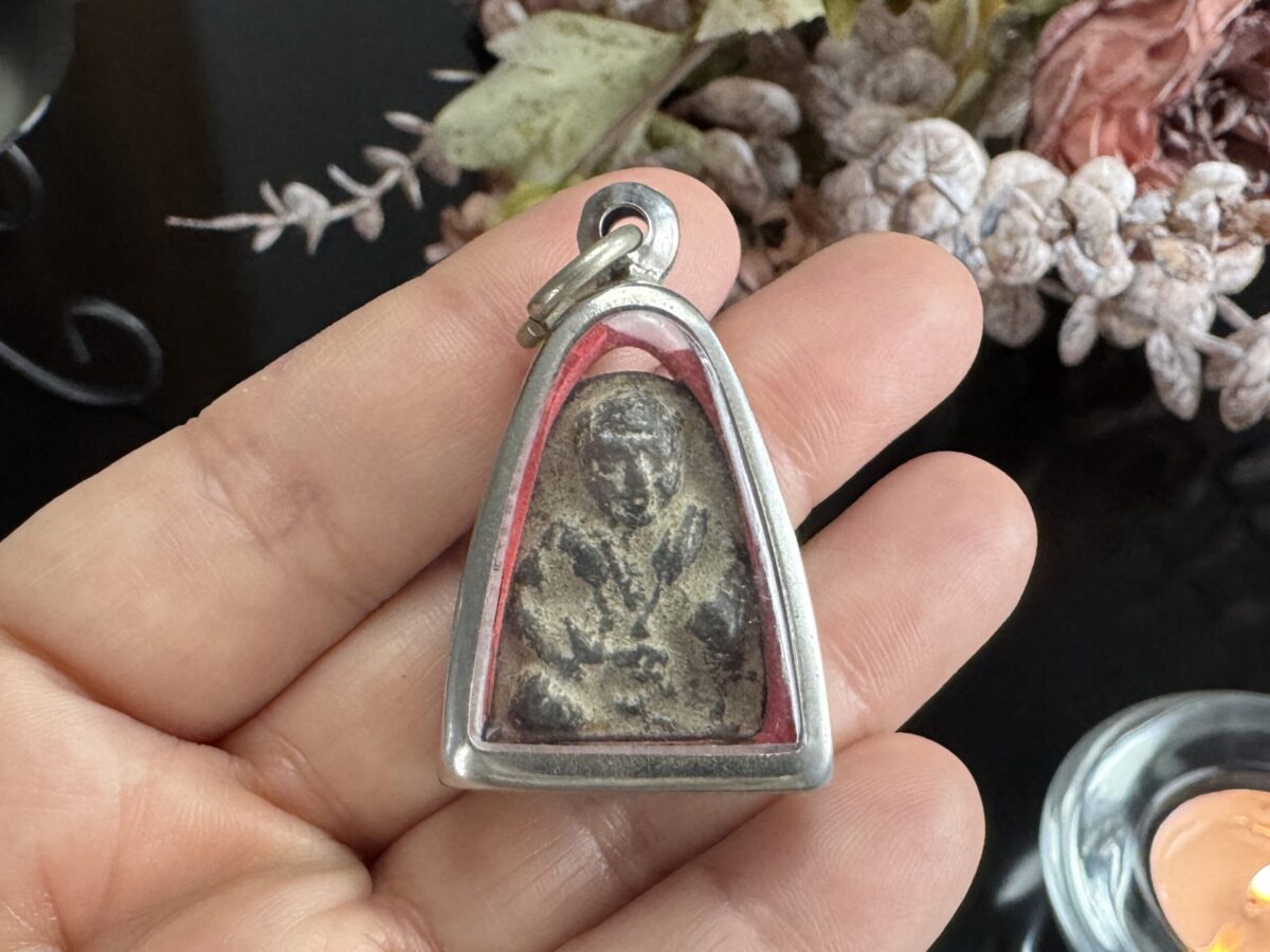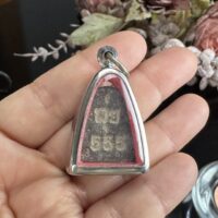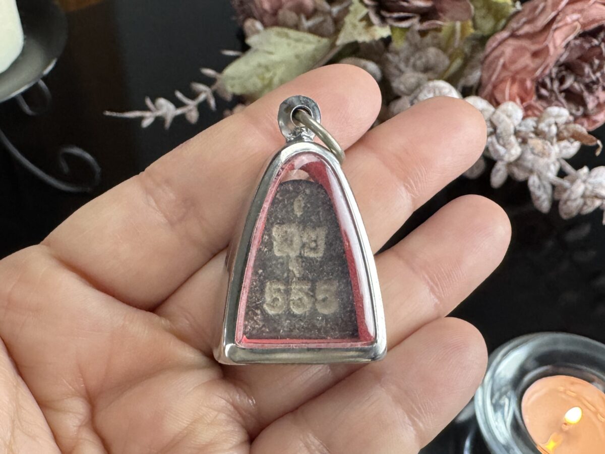 O amuleto está protegido em um estojo tradicional de acrílico e metal, conhecido na Tailândia como “case” ou “locker”. Essa cápsula serve para preservar o amuleto contra umidade, suor, poeira e impactos, permitindo que ele seja carregado no corpo ou manipulado com segurança sem danificar a peça consagrada.