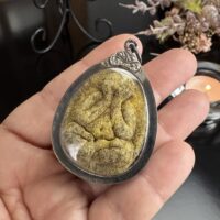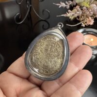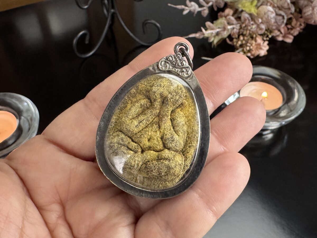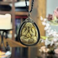 Este amuleto representa Phra Pidta (พระปิดตา), o Buda com as mãos cobrindo o rosto, símbolo de introspecção, fechamento dos sentidos mundanos e blindagem contra influências negativas. Tradicionalmente usado por monges, devotos e praticantes de magia protetiva na Tailândia, o Phra Pidta é considerado um dos mais potentes amuletos para afastar o mal e atrair prosperidade.