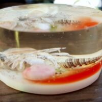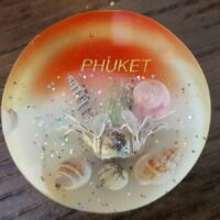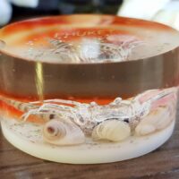 Esta é uma peça muito antiga, com um pequeno crustáceo e conchas da Ilha, preservados em resina.