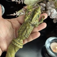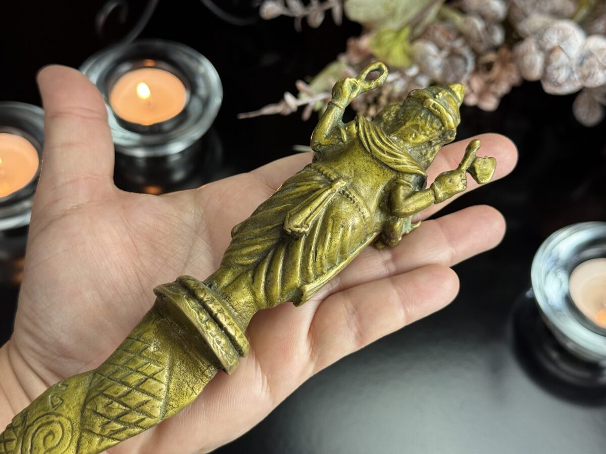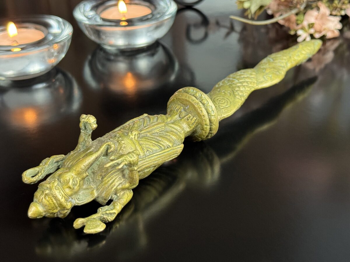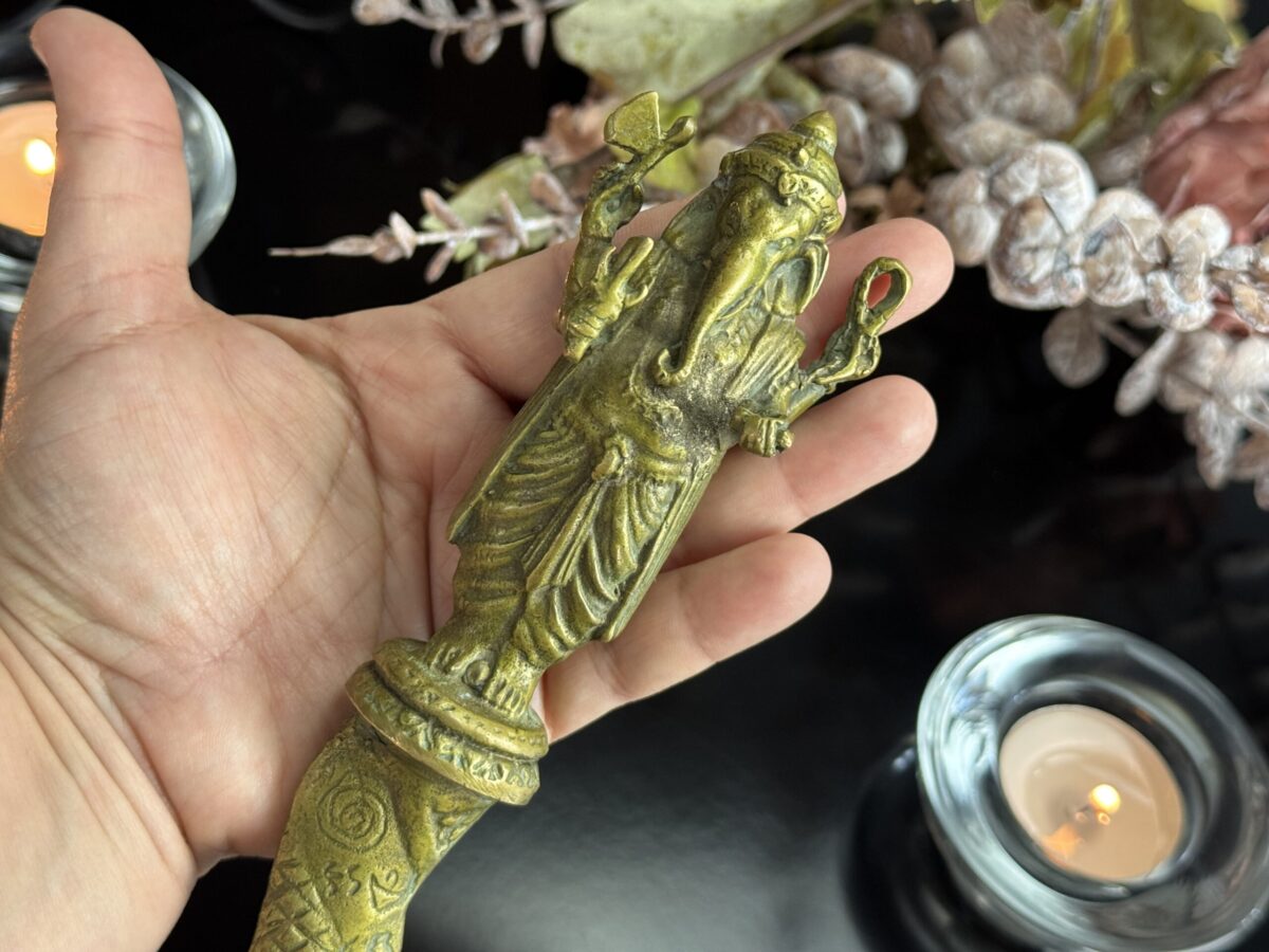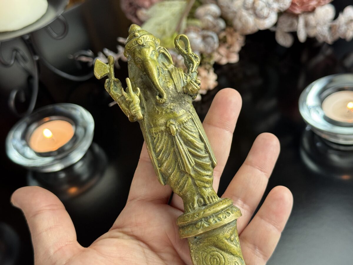 Peça autêntica de antiquário, este punhal cerimonial tailandês, ricamente cinzelado representa Ganesha, o deus das artes, sabedoria e superação de obstáculos, em sua forma mais protetora e auspiciosa. Fundido há várias décadas, é um objeto raro e reverenciado no universo esotérico e espiritual do Sudeste Asiático.