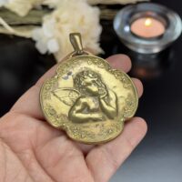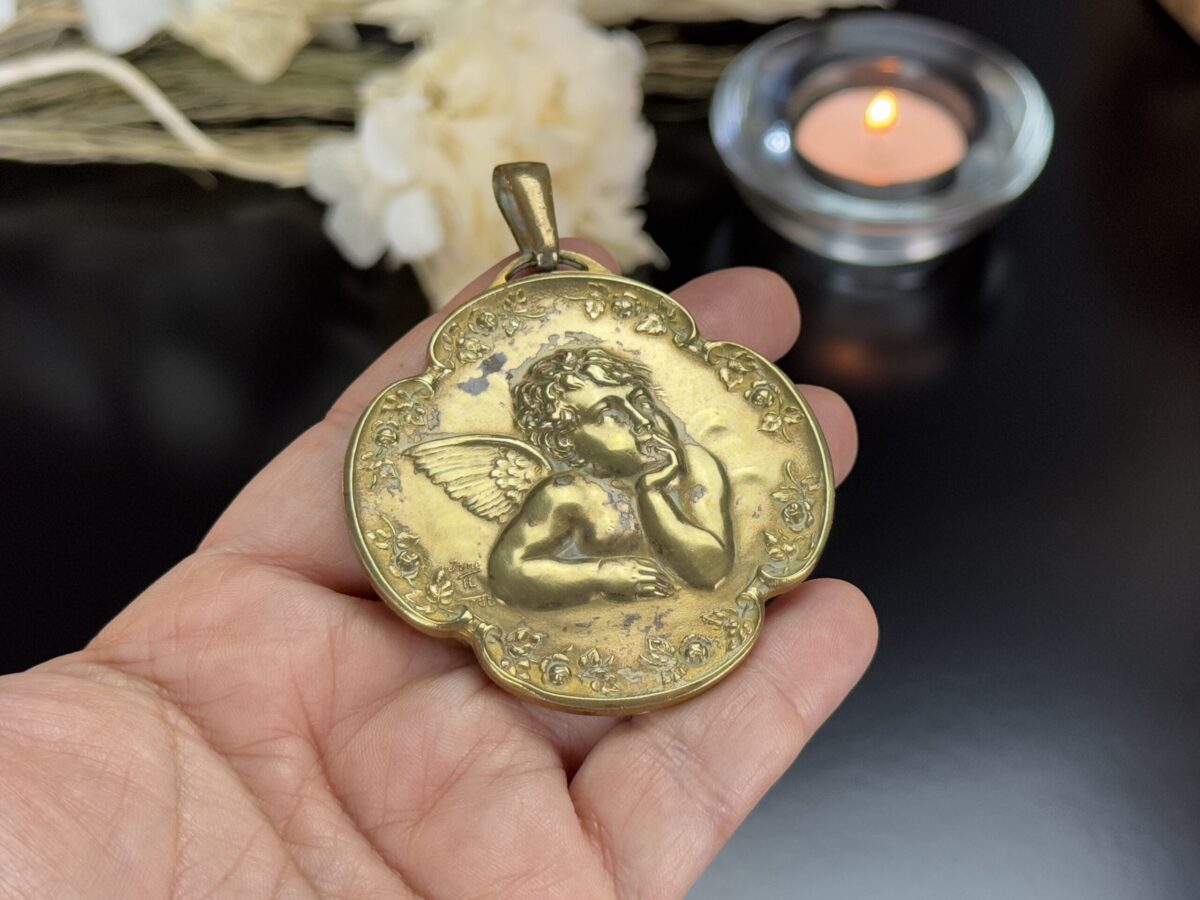 Encantador medalhão de berço em metal dourado, com relevo detalhado de um querubim guardião. Peça delicada e cheia de simbolismo, tradicionalmente usada para proteção e bênçãos no repouso dos recém-nascidos.