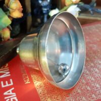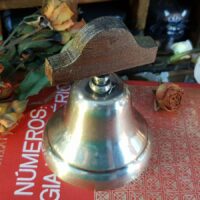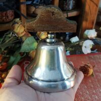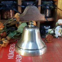 Lindo e antigo sino de metal espessurado à prata com pega de madeira, para altares e rituais de Magia.