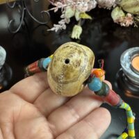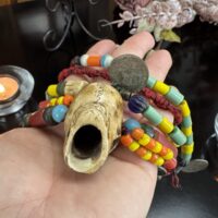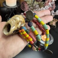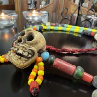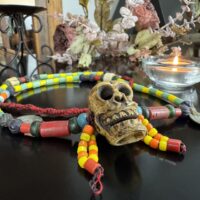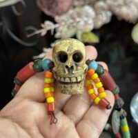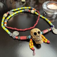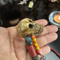 Peça rara e autêntica adquirida em antiquário tradicional de Bangkok, Tailândia. Este colar foi utilizado por um Ajarn (mestre espiritual tailandês) em práticas de magia animista e necromancia, tradições profundamente enraizadas no Sudeste Asiático. O elemento central – um crânio esculpido em osso, é símbolo poder ancestral, domínio sobre os reinos espirituais e proteção contra forças ocultas.