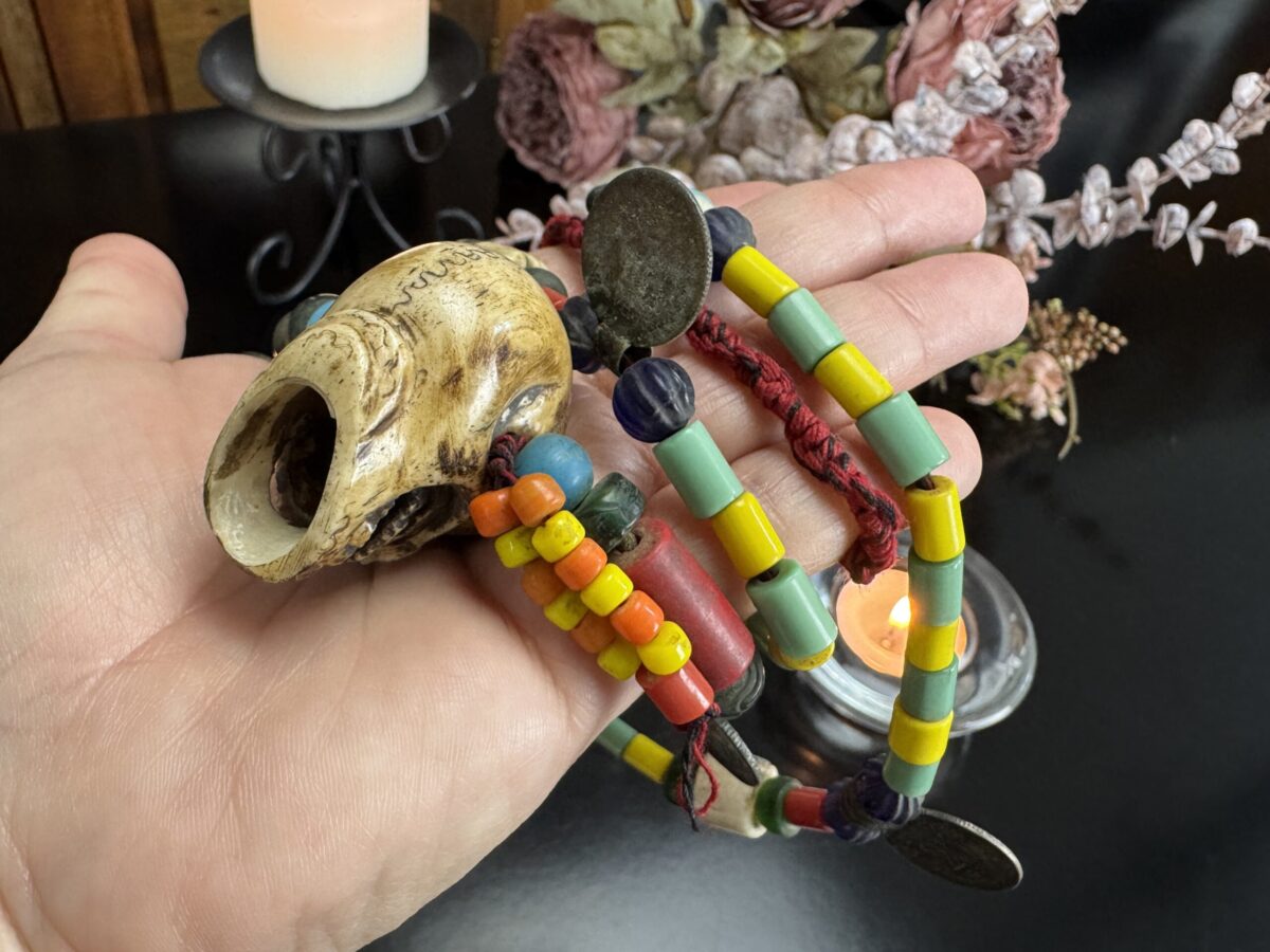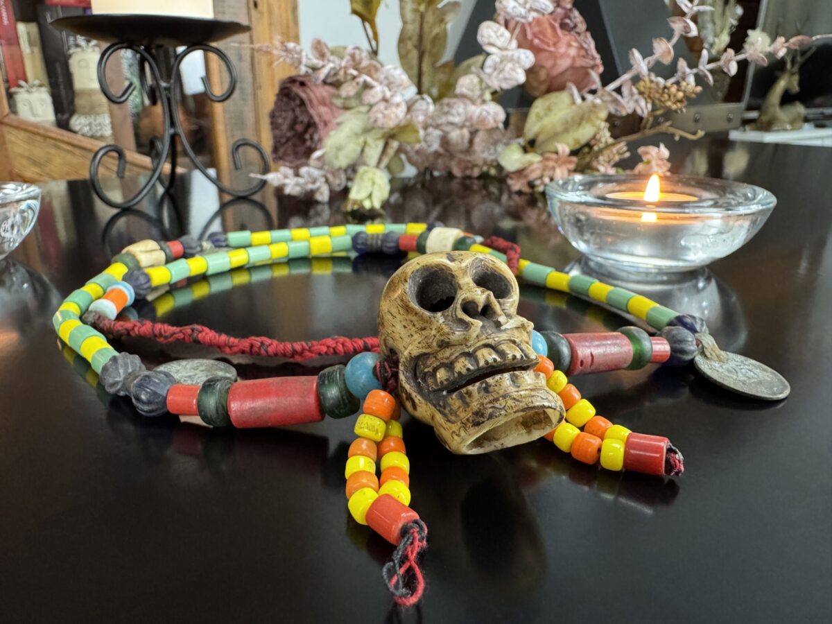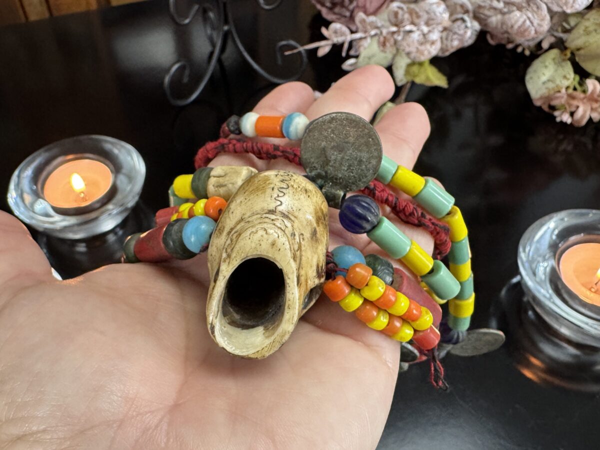 Peça rara e autêntica adquirida em antiquário tradicional de Bangkok, Tailândia. Este colar foi utilizado por um Ajarn (mestre espiritual tailandês) em práticas de magia animista e necromancia, tradições profundamente enraizadas no Sudeste Asiático. O elemento central – um crânio esculpido em osso, é símbolo poder ancestral, domínio sobre os reinos espirituais e proteção contra forças ocultas.