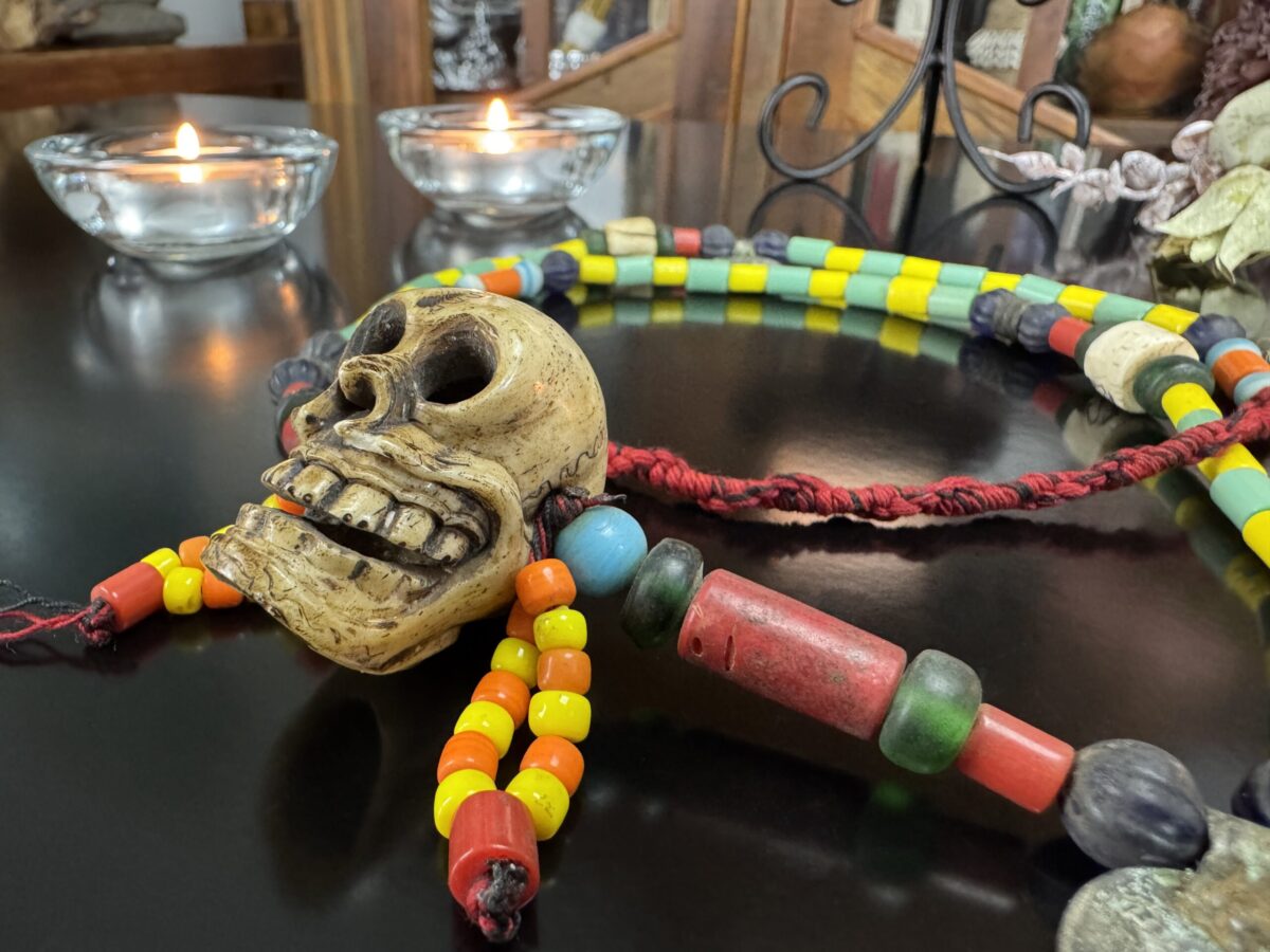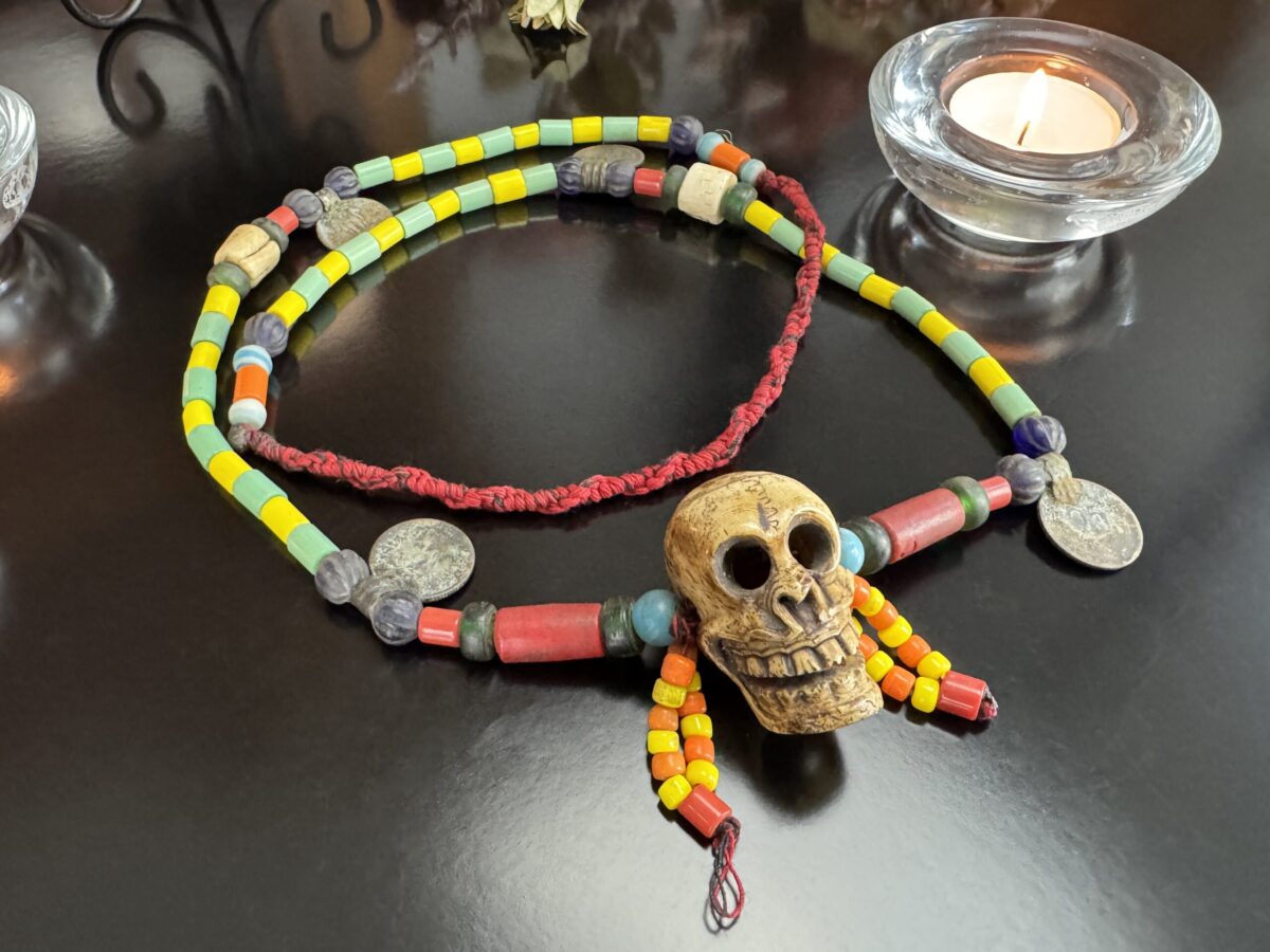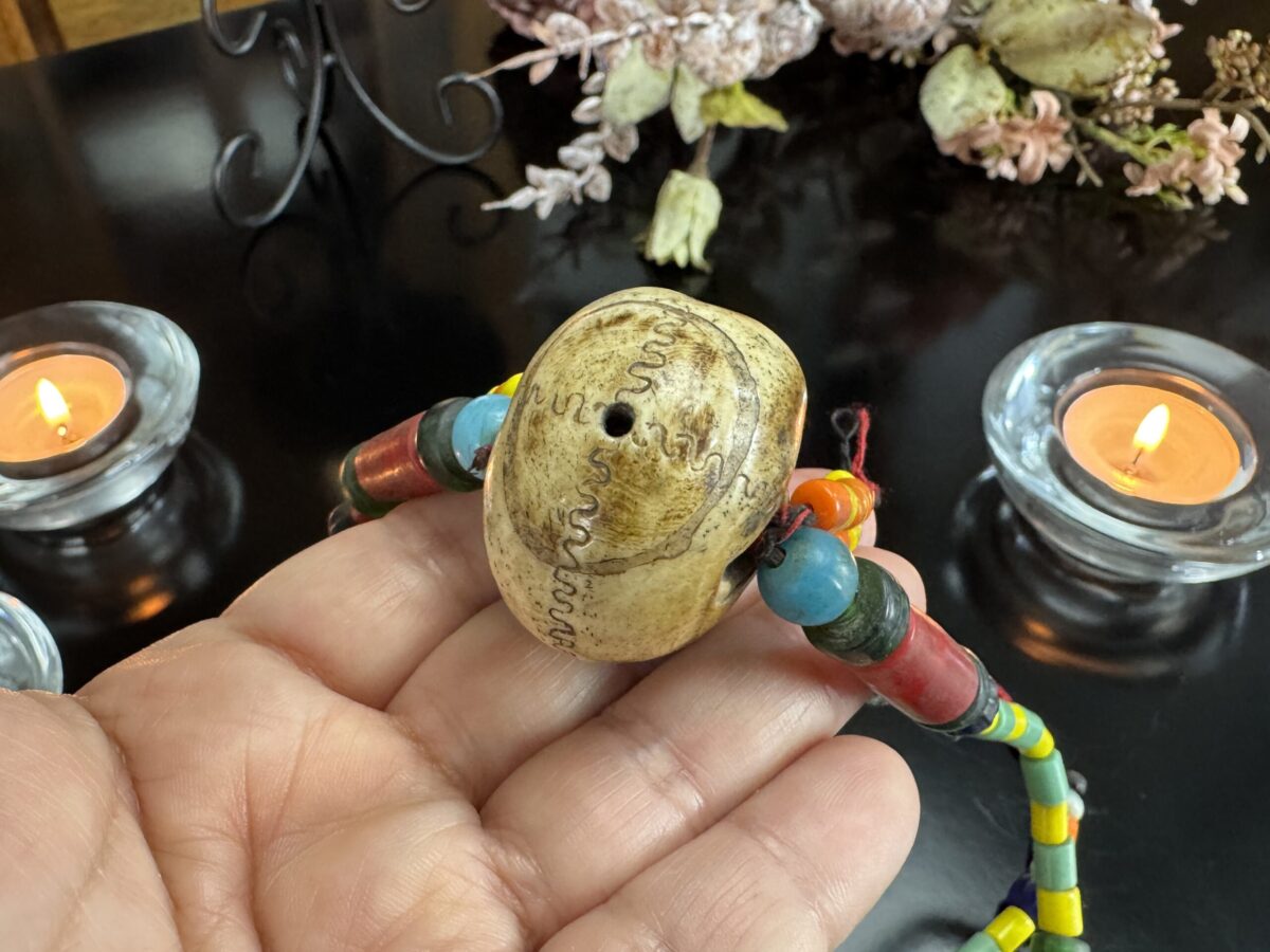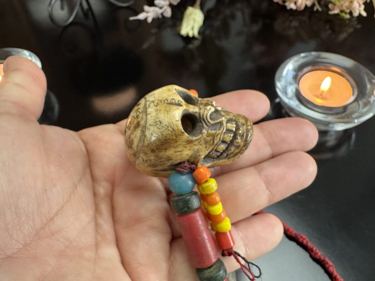 Peça rara e autêntica adquirida em antiquário tradicional de Bangkok, Tailândia. Este colar foi utilizado por um Ajarn (mestre espiritual tailandês) em práticas de magia animista e necromancia, tradições profundamente enraizadas no Sudeste Asiático. O elemento central – um crânio esculpido em osso, é símbolo poder ancestral, domínio sobre os reinos espirituais e proteção contra forças ocultas.