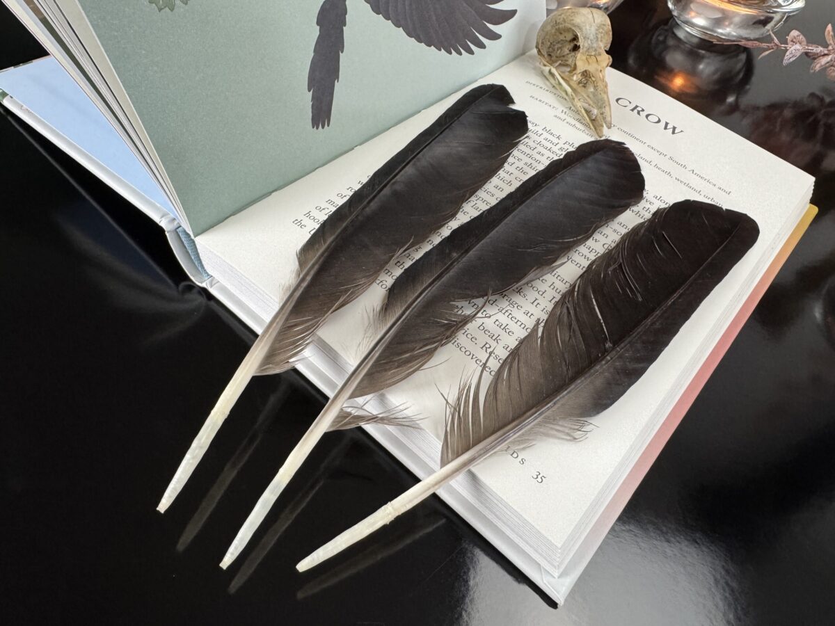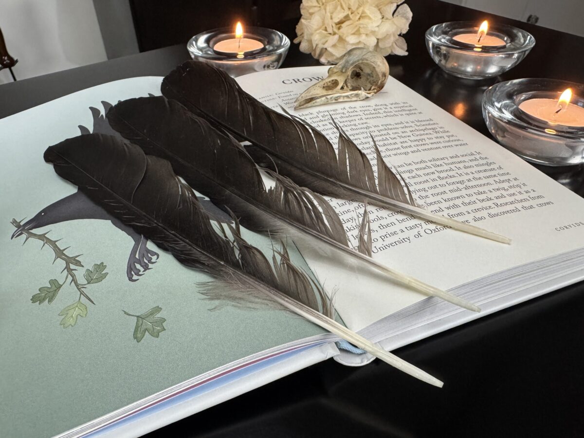 Origem: Autêntica pena de corvo europeu, coletada pessoalmente em território britânico.