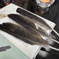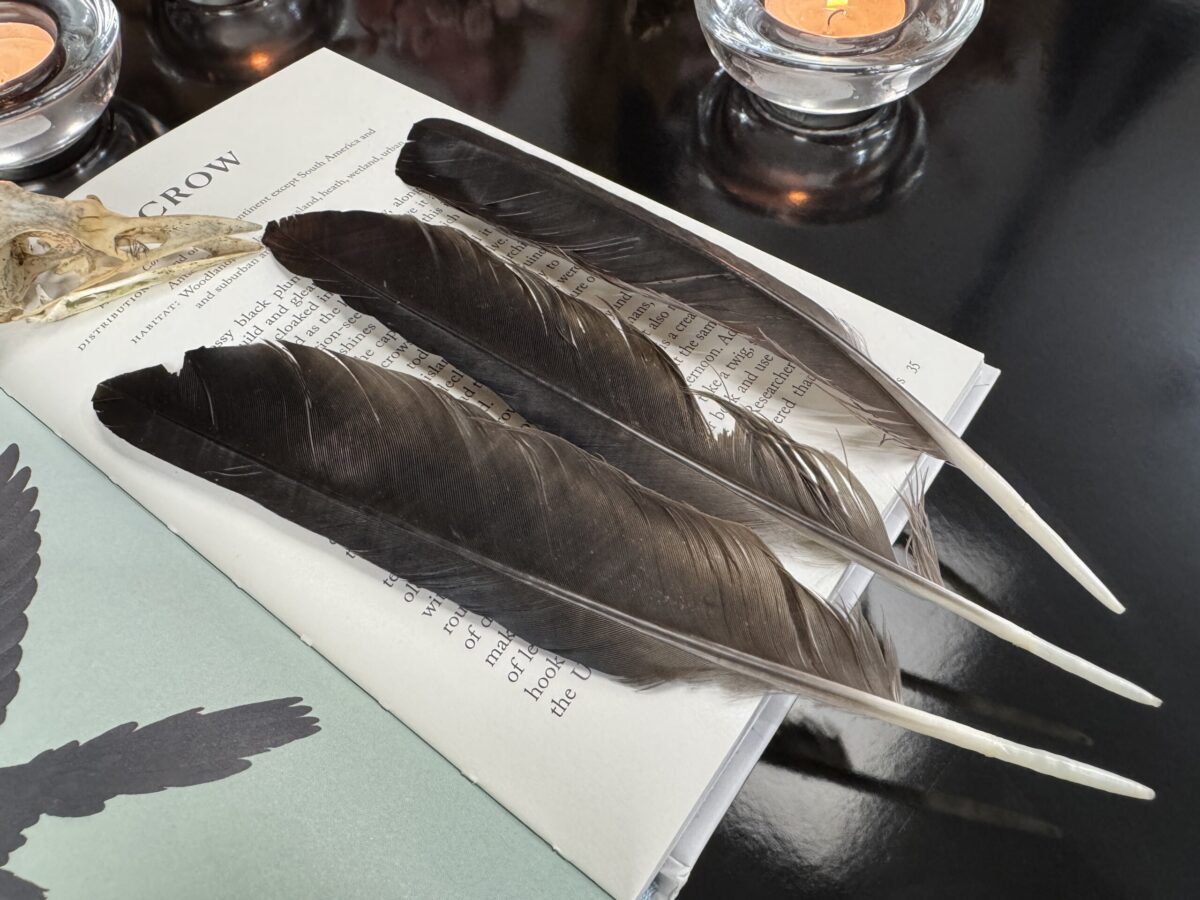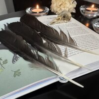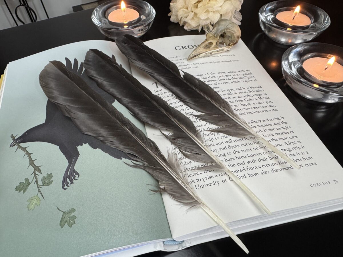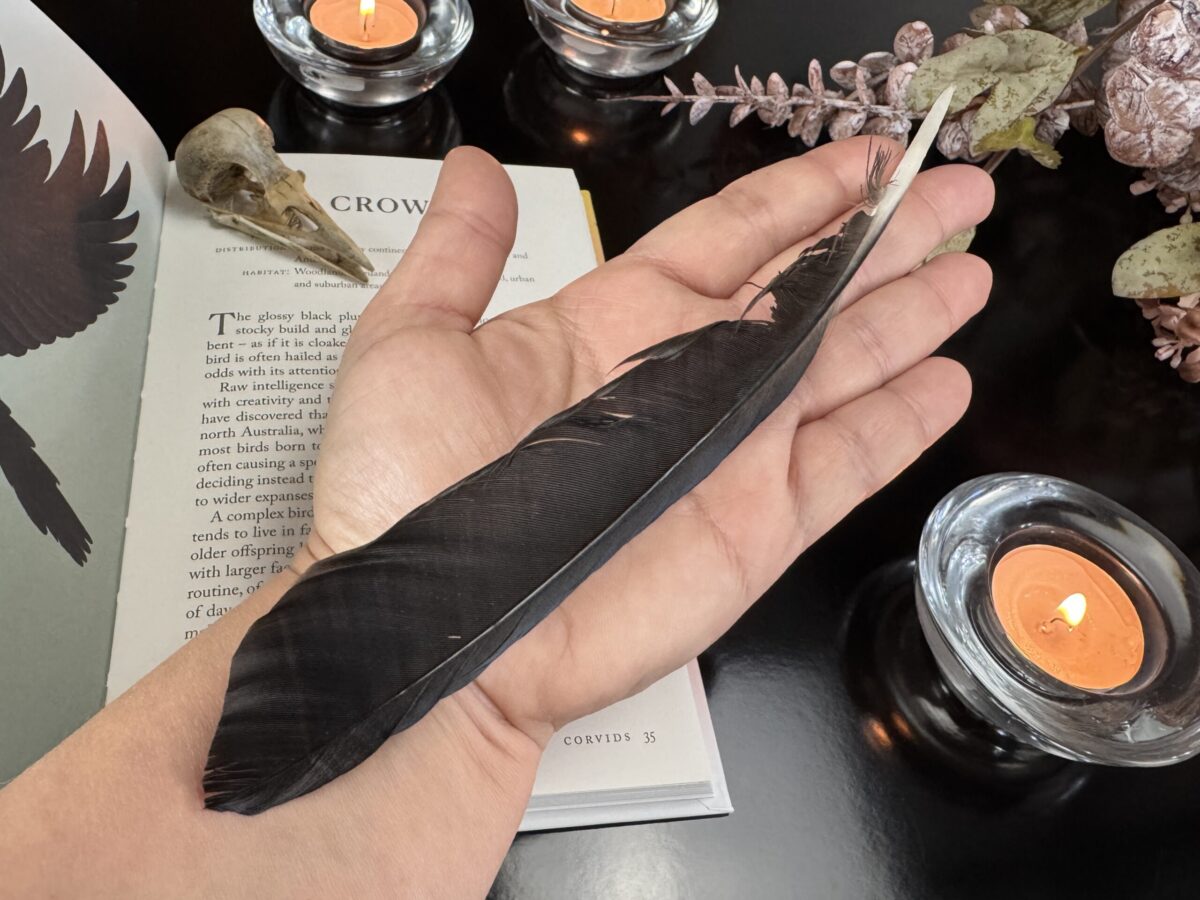 Culto à Morrigan: Em altares ou rituais dedicados à deusa celta da guerra, morte e transformação, a pena atua como oferenda viva, portadora do sopro oracular e da força do campo de batalha.