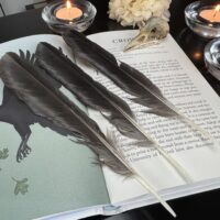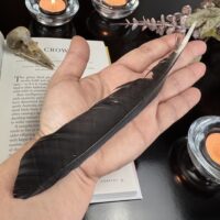 Nem toda magia nasce da perfeição. Algumas das peças mais poderosas carregam em si os sinais do tempo, da jornada e da natureza viva. Esta pena de corvo com marcas naturais de voo é uma dessas raridades: um objeto com alma, forjado pela experiência da ave e pelo sopro dos ventos que cruzam os céus do Reino Unido.
