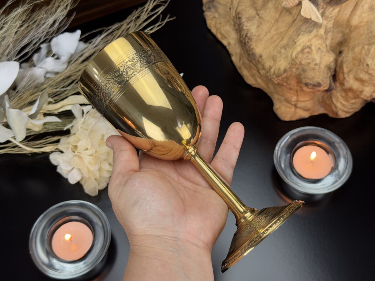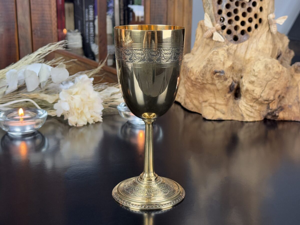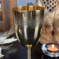 Seu design imponente e peso equilibrado fazem deste cálice uma escolha perfeita para altares, rituais e celebrações. No mundo esotérico, o cálice simboliza a receptividade, a intuição e o sagrado feminino, sendo amplamente utilizado em práticas mágicas e cerimônias espirituais.