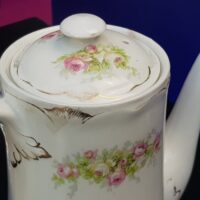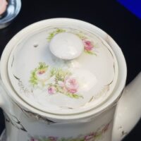 Maravilhoso bule de marca inglesa, numeração A 1478, década de 30, em porcelana decorado com rosas, guirlandas e arabescos dourados (ouro).