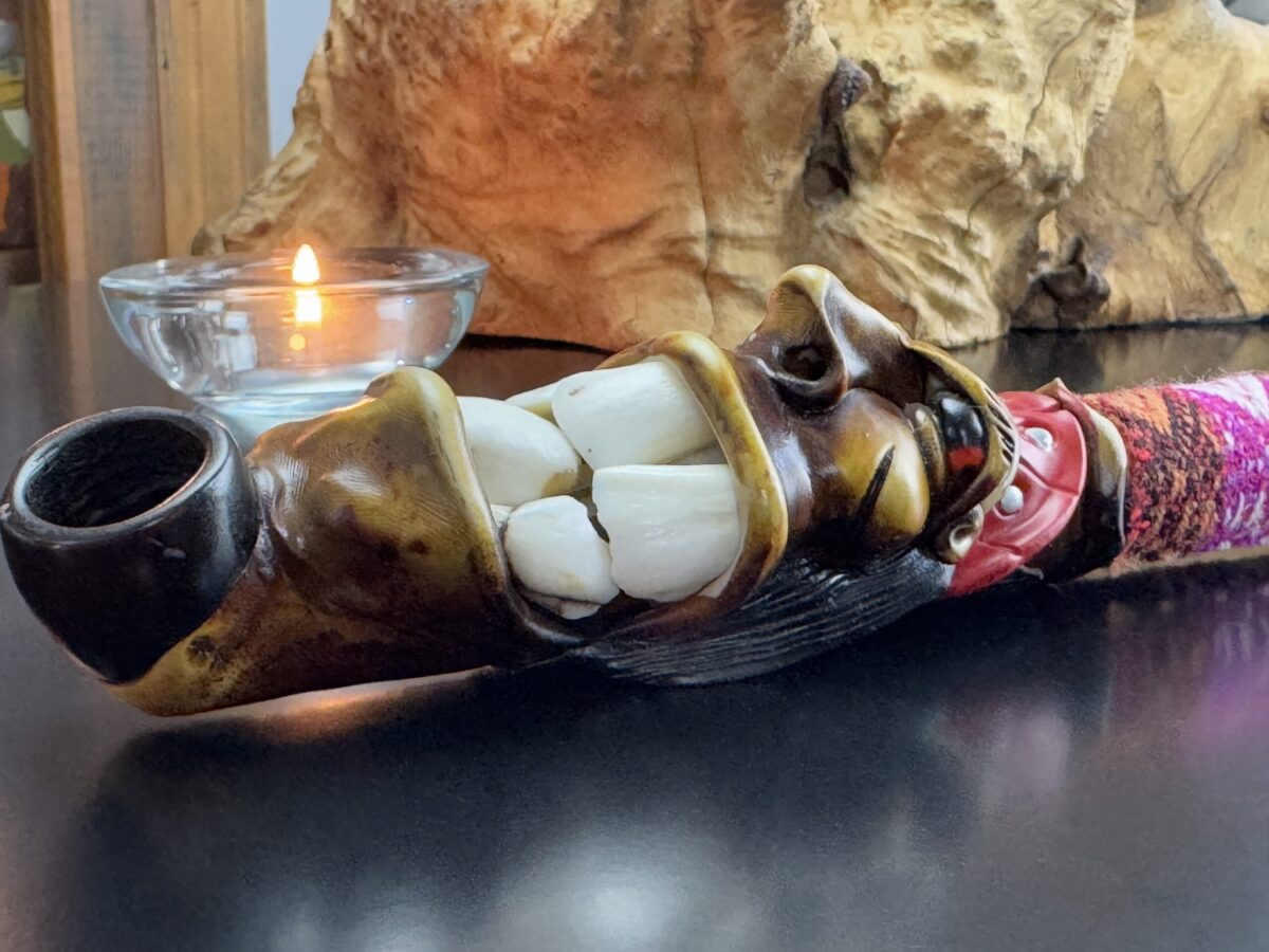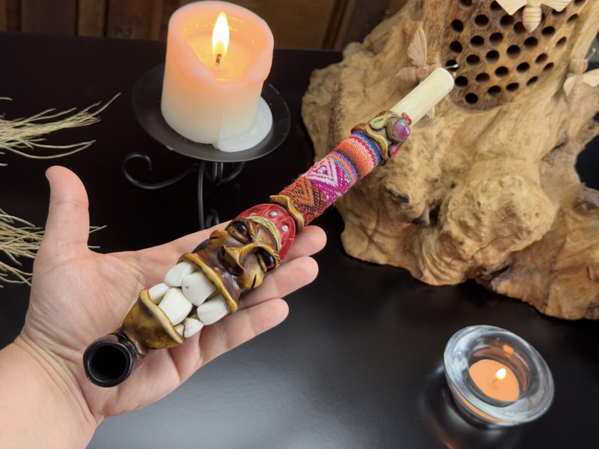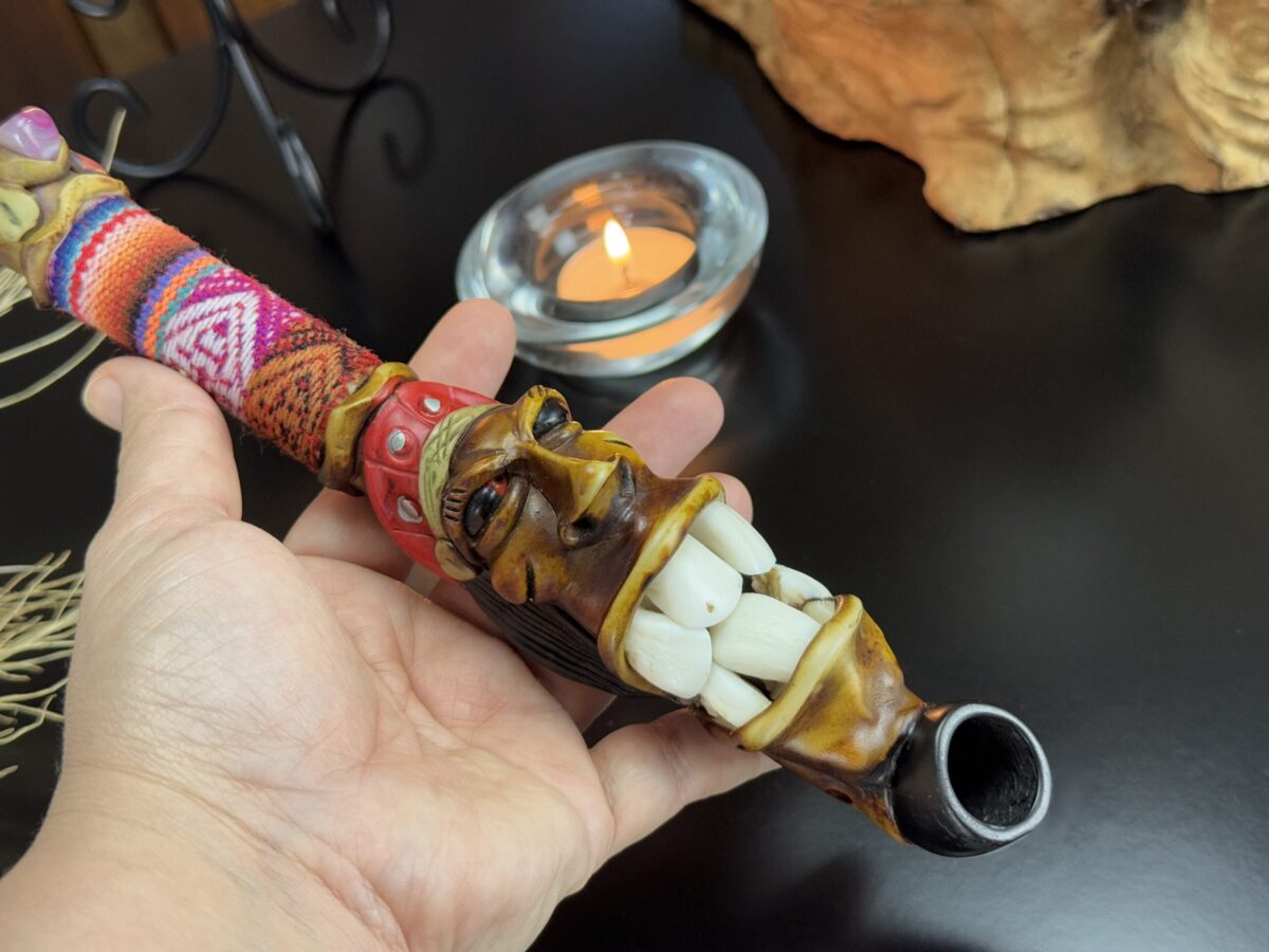 ✔ Origem Cultural: Produzido no Peru, esse cachimbo reflete a arte e a devoção dos artesãos andinos. Cada detalhe foi elaborado à mão, com materiais naturais, destacando a habilidade e a dedicação dos artistas locais.