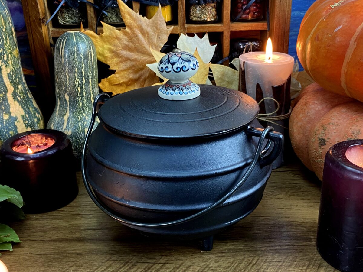 Caldeirão da Bruxa – Instrumento caldeirão – Caldeirão bruxaria – Caldeirão Magia – Caldeirão de ferro 2 litros com puxador em cerâmica artesanal