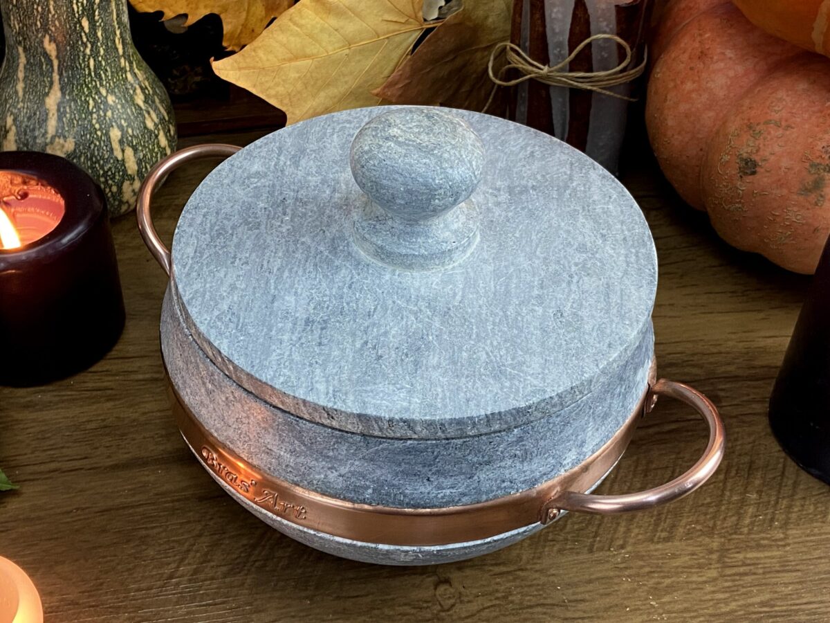 - Caldeirão em pedra e cobre com tampa