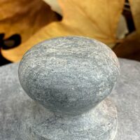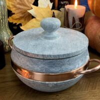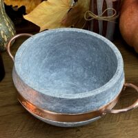 Lindíssimo caldeirão em Esteatito (pedra sabão) com capacidade de 1.5 L. A peça possui cinta e puxadores em cobre maciço e segue com instruções para a cura antes da primeira utilização.