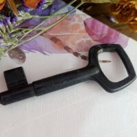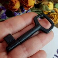 Antiga e com marcas naturais do tempo e de uso, ela provavelmente abria armário ou cristaleira daquela época. De ferro, esta chave é sem dúvida uma peça carregada de história, e terá uma utilização muito especial nas mãos do praticante de Magia que sabe lidar com este tipo de instrumento.