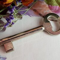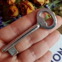 Antiga e com marcas naturais do tempo e de uso, ela provavelmente abria armário ou cristaleira daquela época. De metal prateado, esta chave é sem dúvida uma peça carregada de história, e terá uma utilização muito especial nas mãos do praticante de Magia que sabe lidar com este tipo de instrumento.