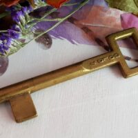 Antiga e com marcas naturais do tempo e de uso, ela provavelmente abria armário ou cristaleira daquela época. De bronze maciço, esta chave é sem dúvida uma peça carregada de história, e terá uma utilização muito especial nas mãos do praticante de Magia que sabe lidar com este tipo de instrumento.