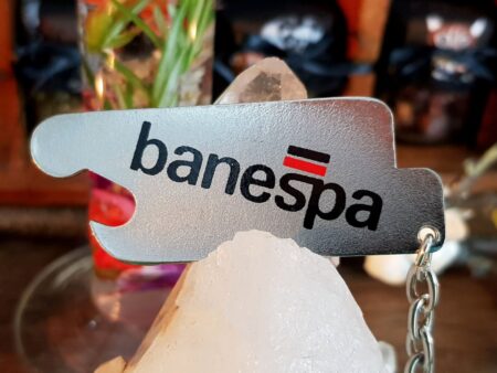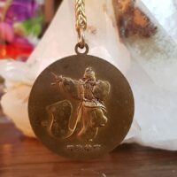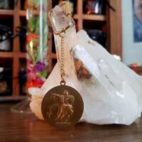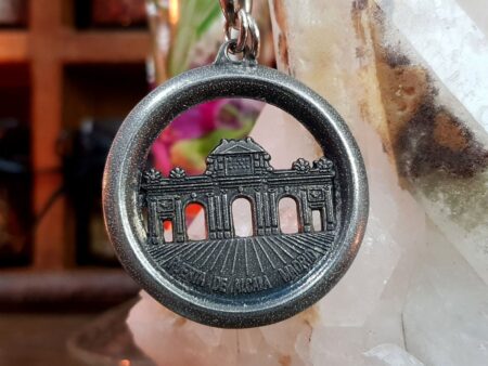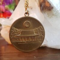 Belíssimo chaveiro japonês em bronze com relevo, lustrando figura e templo em seus versos.