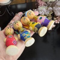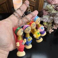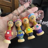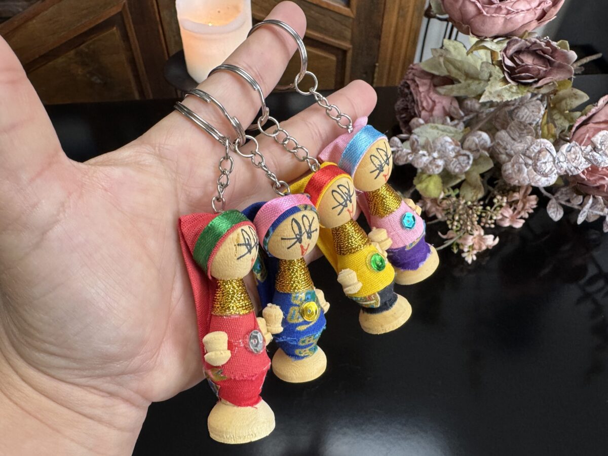 Diretamente da vila da tribo Padaung, também conhecida como o povo das “mulheres-girafa”, no norte da Tailândia, este conjunto de chaveiros representa uma das culturas mais fascinantes do sudeste asiático. Cada boneca é feita à mão pelas artesãs locais, com roupas coloridas tradicionais e detalhes bordados, refletindo o vestuário cerimonial das mulheres da tribo.