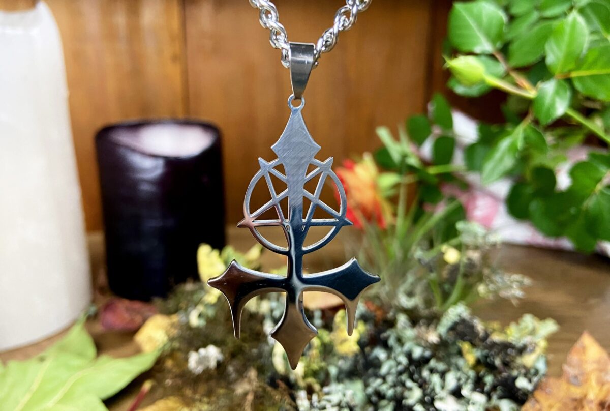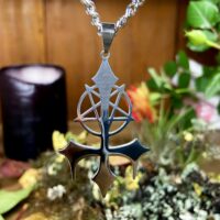 Imponente pingente com corrente em aço inoxidável representando Pentagrama e Cruz invertida.