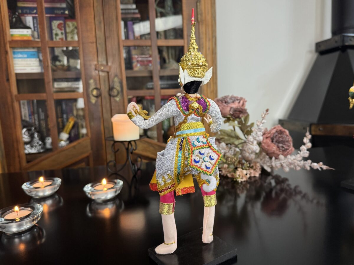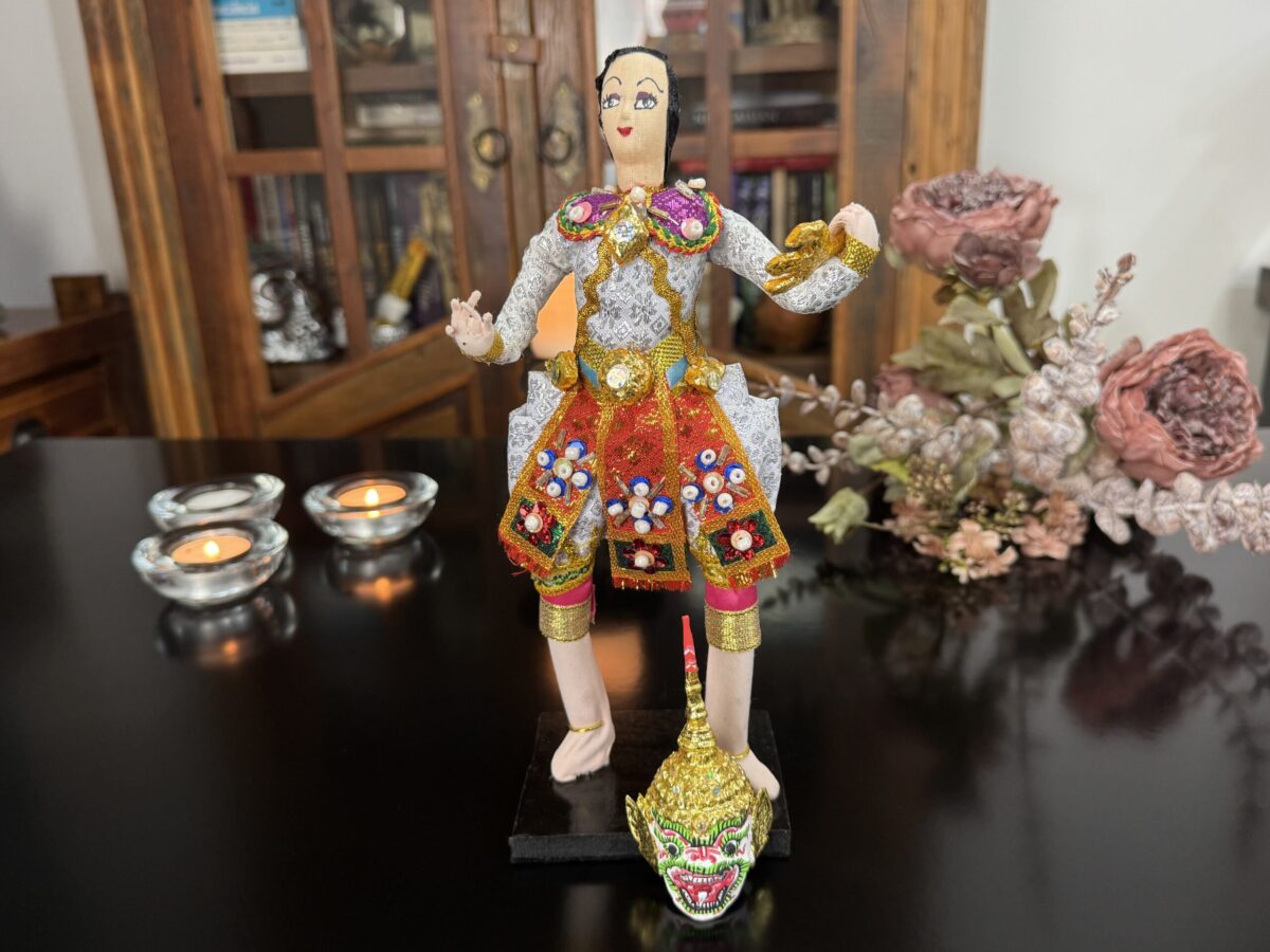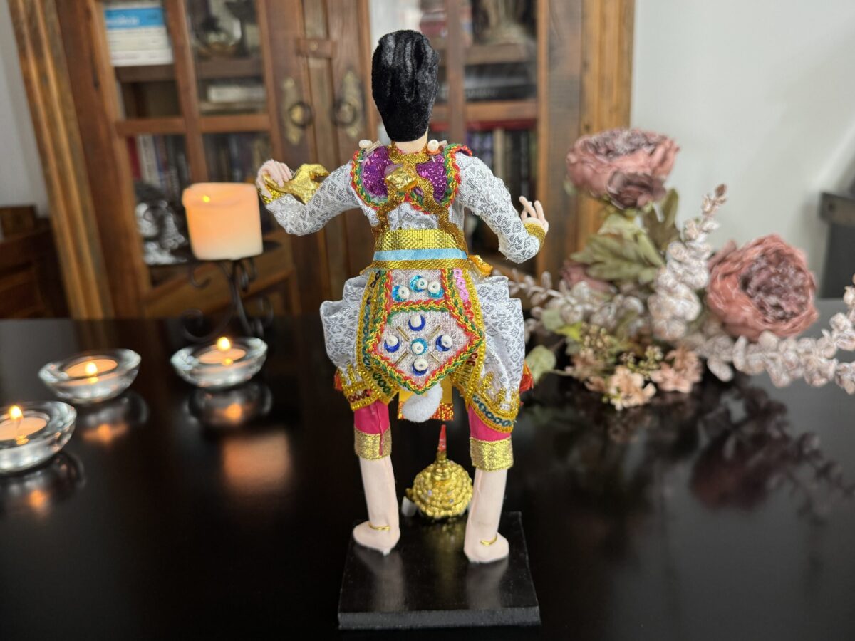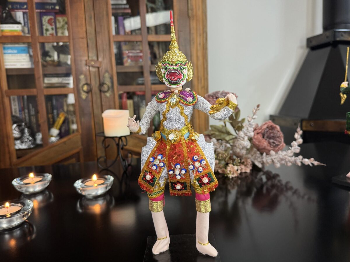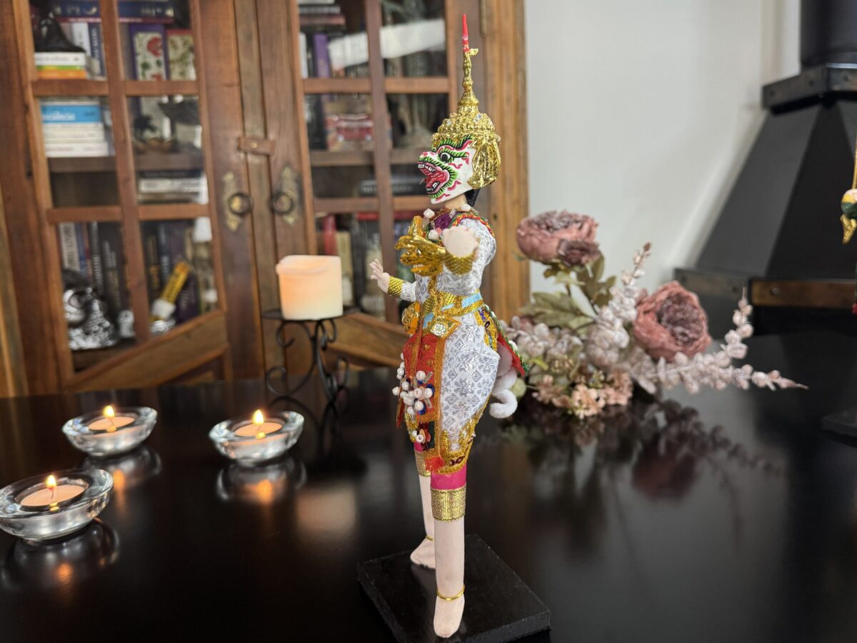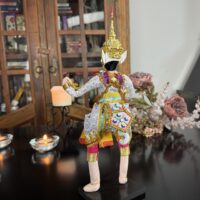 Inspirado na tradição do teatro Khon, o boneco veste trajes rituais bordados à mão e ostenta uma máscara cerimonial, que pode ser removida — gesto simbólico da transição entre o divino e o humano. Ao retirar a máscara, revela-se o rosto do intérprete, evocando o momento em que a divindade se manifesta e depois retorna ao seu plano espiritual.
