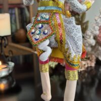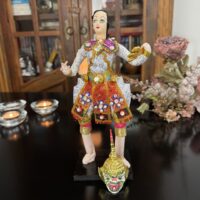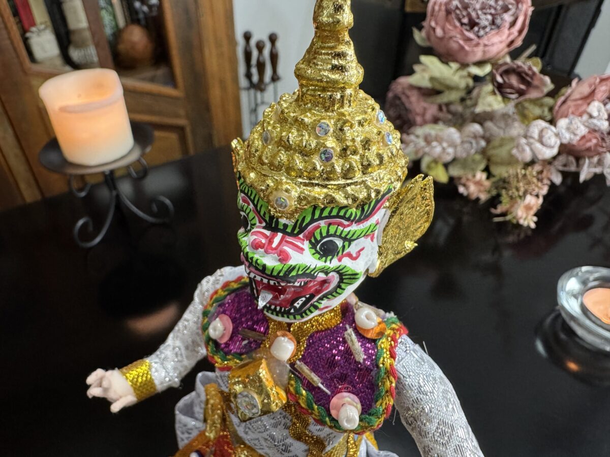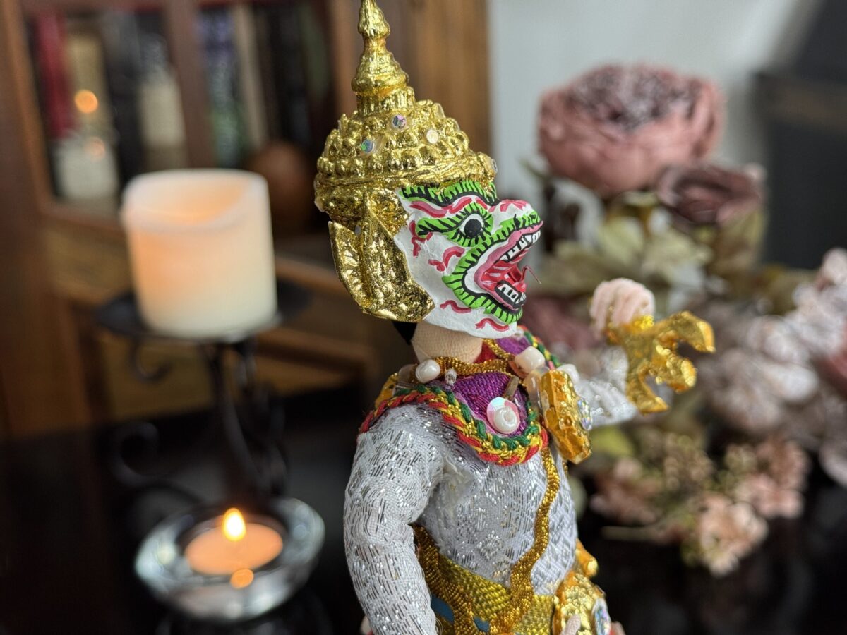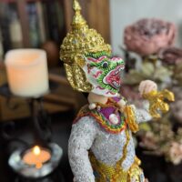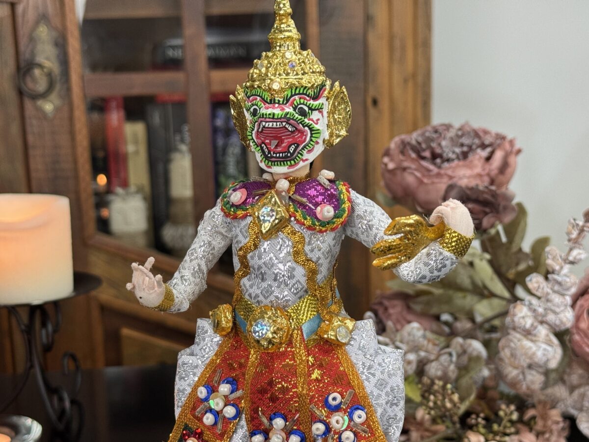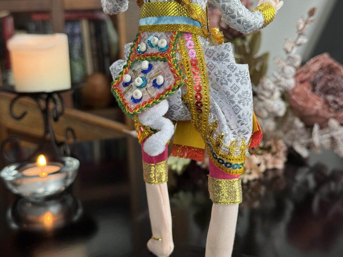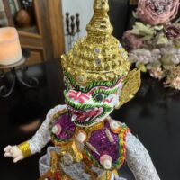 Inspirado na tradição do teatro Khon, o boneco veste trajes rituais bordados à mão e ostenta uma máscara cerimonial, que pode ser removida — gesto simbólico da transição entre o divino e o humano. Ao retirar a máscara, revela-se o rosto do intérprete, evocando o momento em que a divindade se manifesta e depois retorna ao seu plano espiritual.