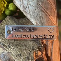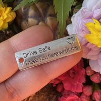 Pendant em liga metálica, representando plaquinha com escrita: “Drive Safe, I need you here with me” (Dirija com segurança, preciso de você aqui comigo), para trabalhos com amuletos Mojos, Poppets e outras magias que busquem segurança em viagens, proteção a um motorista etc…