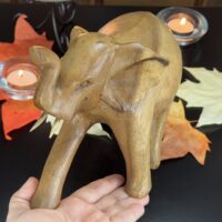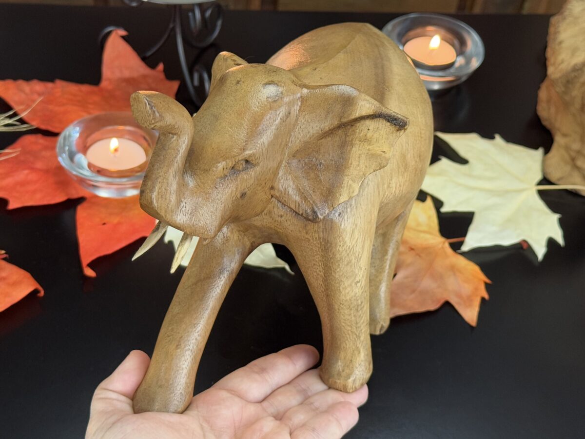 Com sua tromba elevada, esta escultura é um poderoso amuleto de boa sorte e positividade, perfeito para decorar sua casa ou altar, além de ser uma peça exclusiva de beleza incomparável.