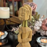 Peça artesanal esculpida em madeira por artesãs da etnia Karen (grupo Padaung), conhecidas mundialmente como as “mulheres pescoço longo” do norte da Tailândia. Representa uma figura feminina tradicional com seus característicos anéis metálicos no pescoço – símbolo de beleza, identidade e resistência cultural.
