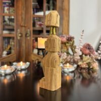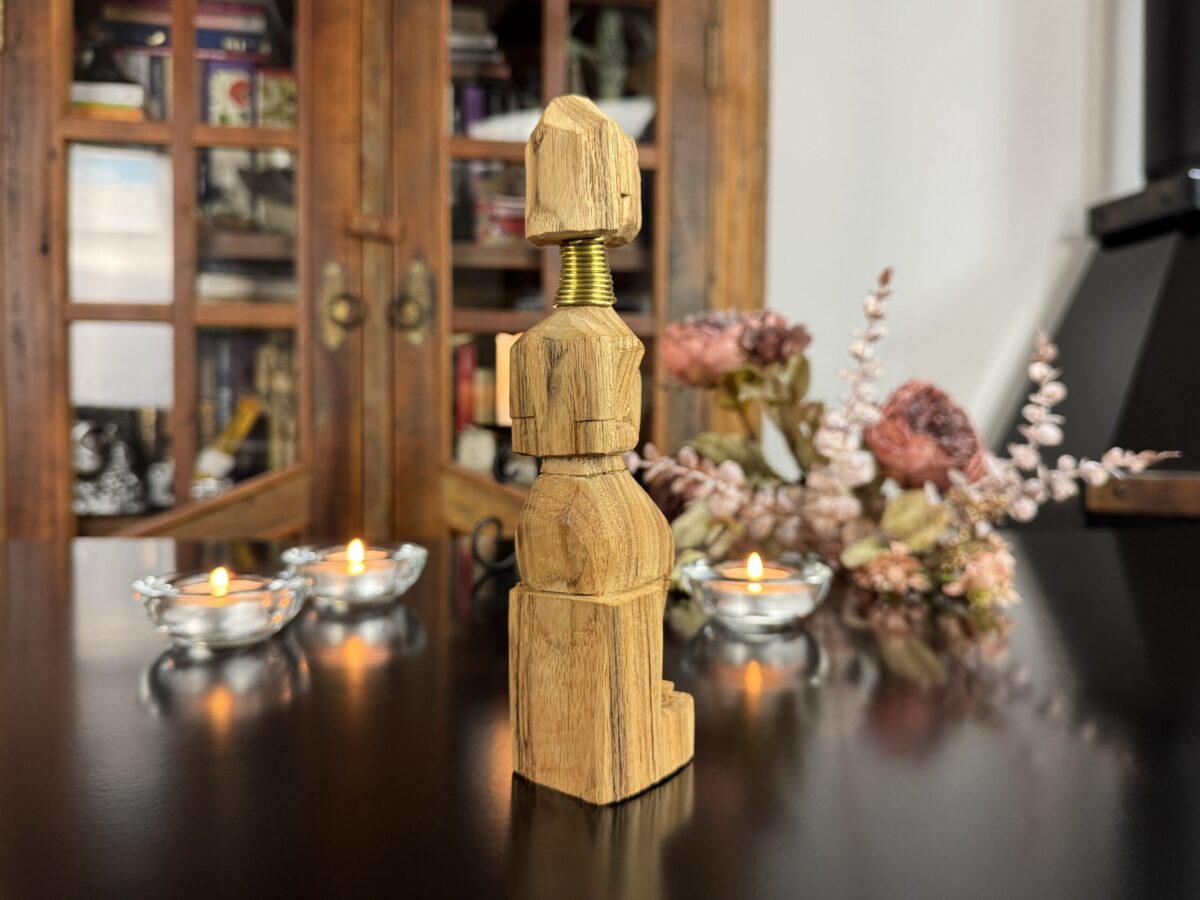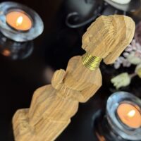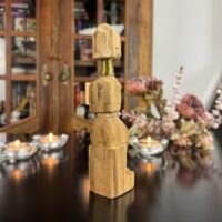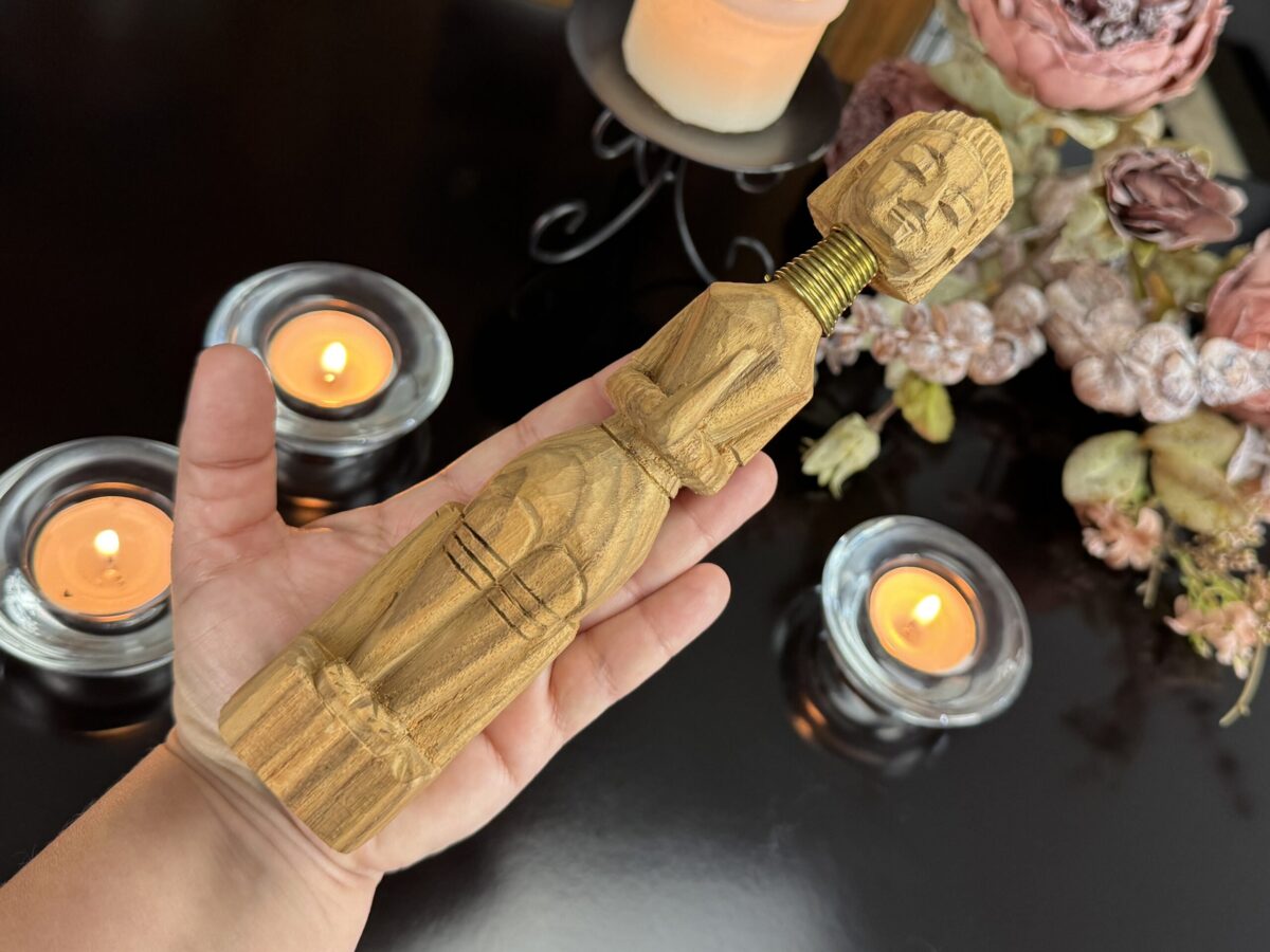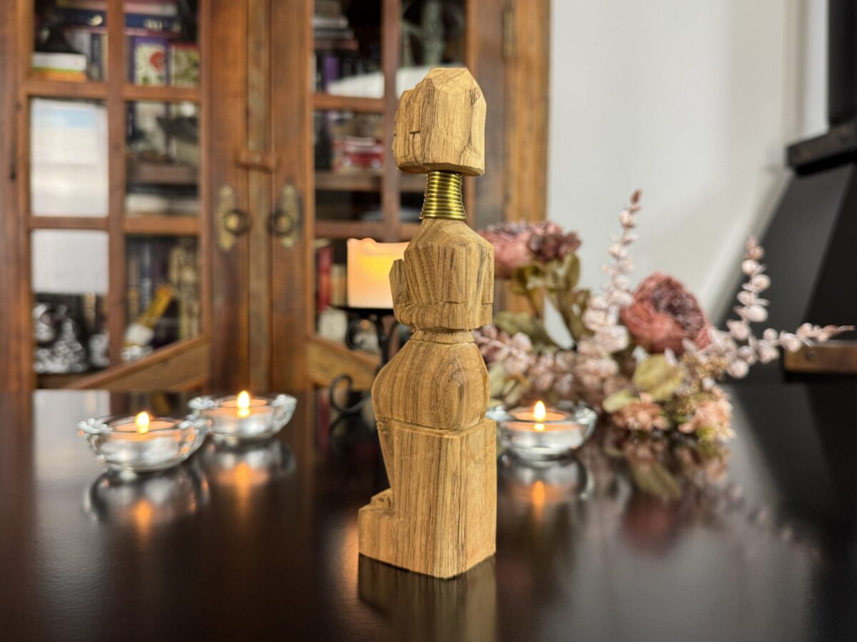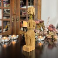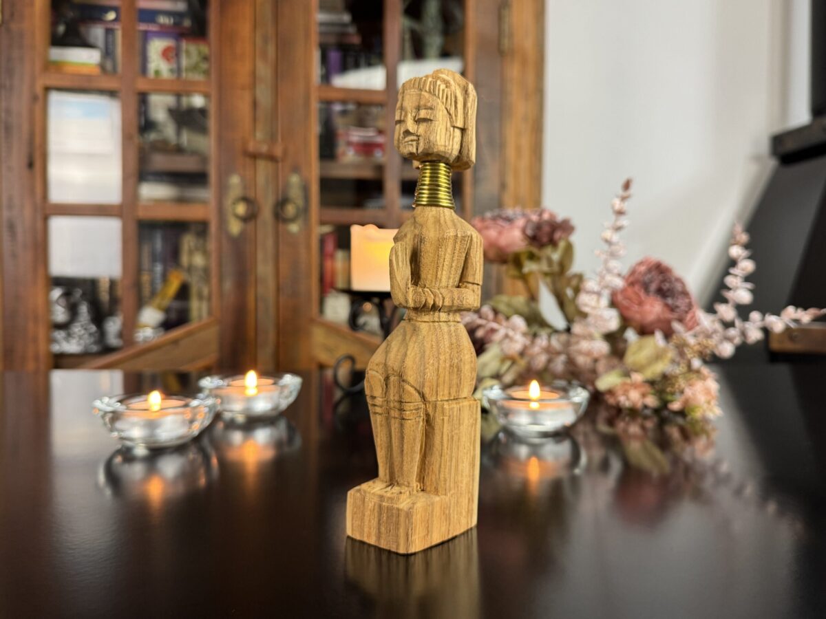 Cada detalhe da peça, do turbante ao vestido entalhado, reflete o estilo e a tradição das vilas da região de Chiang Rai, onde essas esculturas são feitas à mão por comunidades locais.