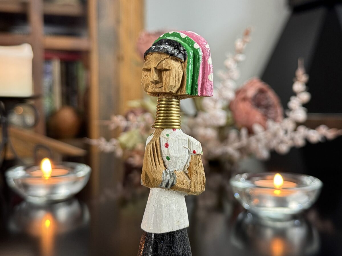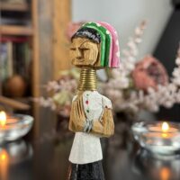 Peça artesanal esculpida em madeira por artesãs da etnia Karen (grupo Padaung), conhecidas mundialmente como as “mulheres pescoço longo” do norte da Tailândia. Representa uma figura feminina tradicional com seus característicos anéis metálicos no pescoço – símbolo de beleza, identidade e resistência cultural.