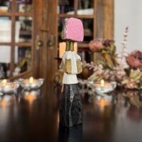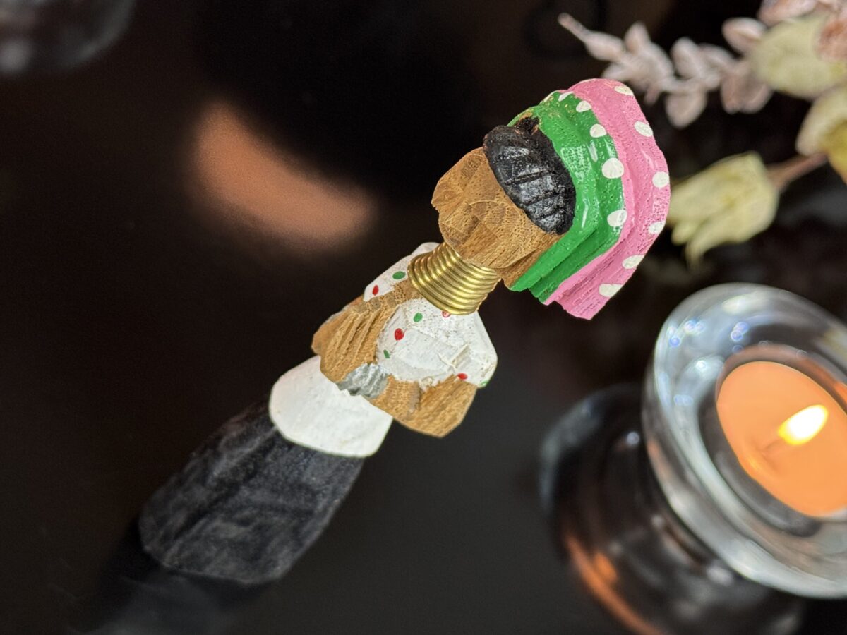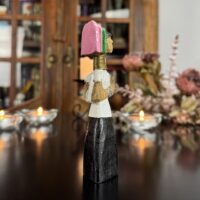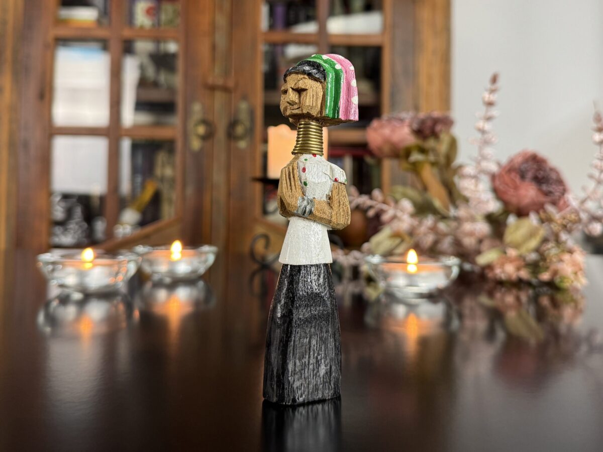 Cada detalhe da peça, do turbante ao vestido entalhado, reflete o estilo e a tradição das vilas da região de Chiang Rai, onde essas esculturas são feitas à mão por comunidades locais.