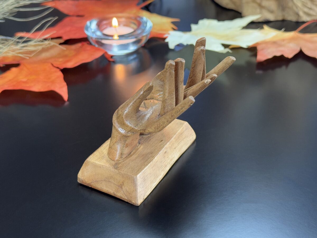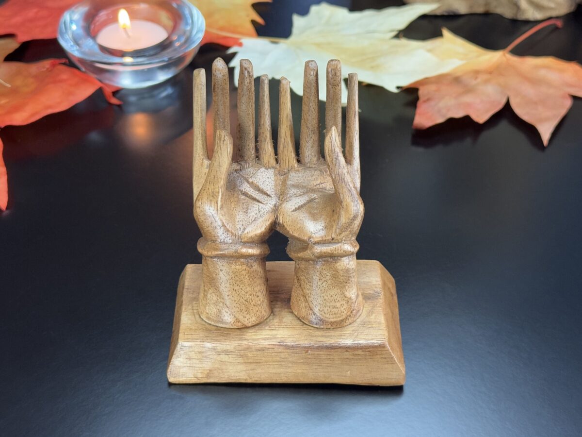 Esta delicada escultura em madeira, entalhada à mão por artesãos de Bali, captura a essência da espiritualidade e da arte tradicional indonésia. Representando mãos erguidas em um gesto simbólico, a peça exala serenidade e equilíbrio, sendo ideal para quem valoriza a conexão entre arte e espiritualidade.