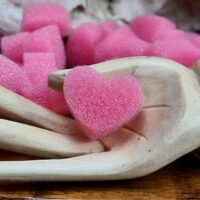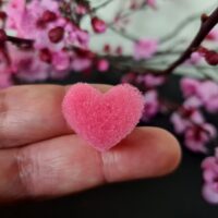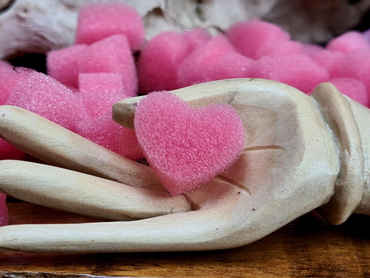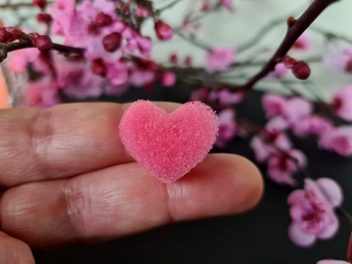 Mini esponjinha com formato de coração rosa, para apagar caneta mágica em trabalhos com Poppets e escrita mágica onde o propósito é alterável.