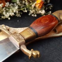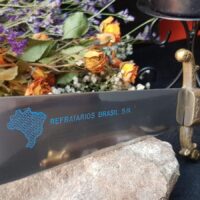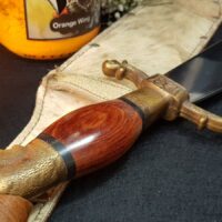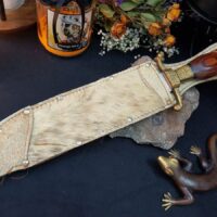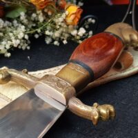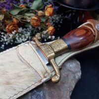 - Composição: Aço inox, madeira e bronze – Bainha de couro bovino curtido com metais