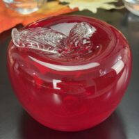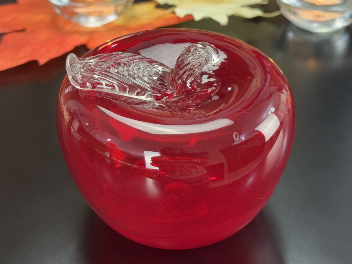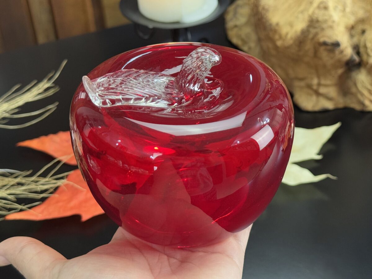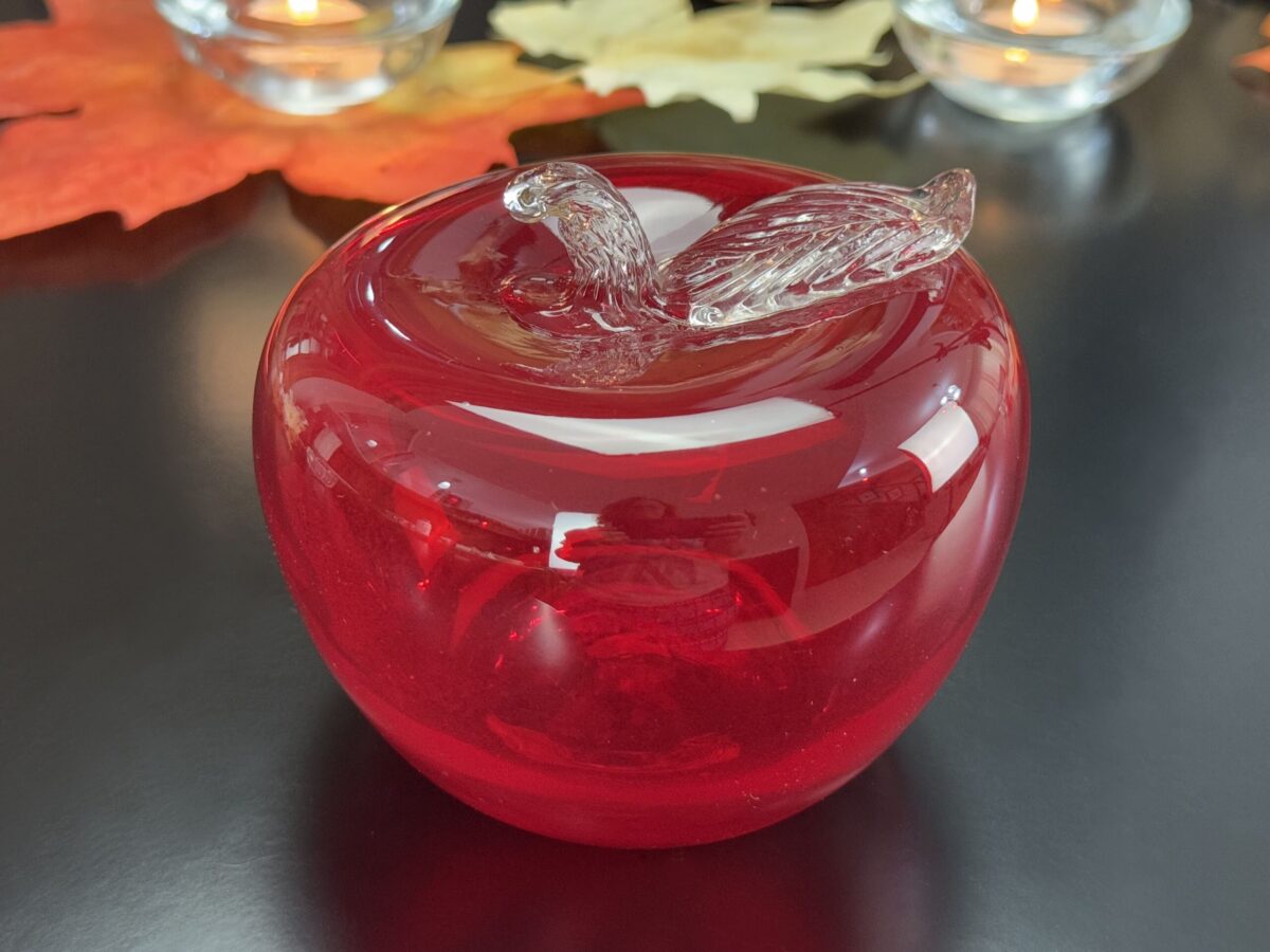*A maçã é uma peça decorativa e simbólica, feita inteiramente de vidro vermelho translúcido. Sua estrutura sólida não possui partes móveis (não abre) ou divisórias.