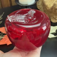 Esta majestosa maçã de vidro vermelho é uma peça imponente e cheia de simbolismo espiritual, perfeita para decorar altares ou espaços sagrados. Sua forma delicada e o brilho intenso do vidro fazem dela uma expressão de beleza e significado.