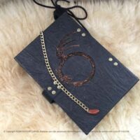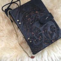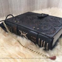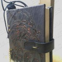 Livro artesanal costurado à mão nos moldes medievais do século XV, de couro legítimo, com pirografia e pintura manual.