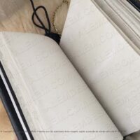 - Capa e contra-capa de madeira, revestidas em couro legítimo, trabalhadas com gravação manual em pirografia