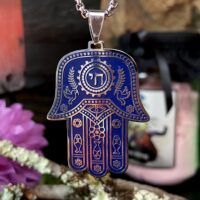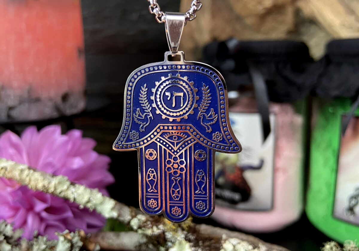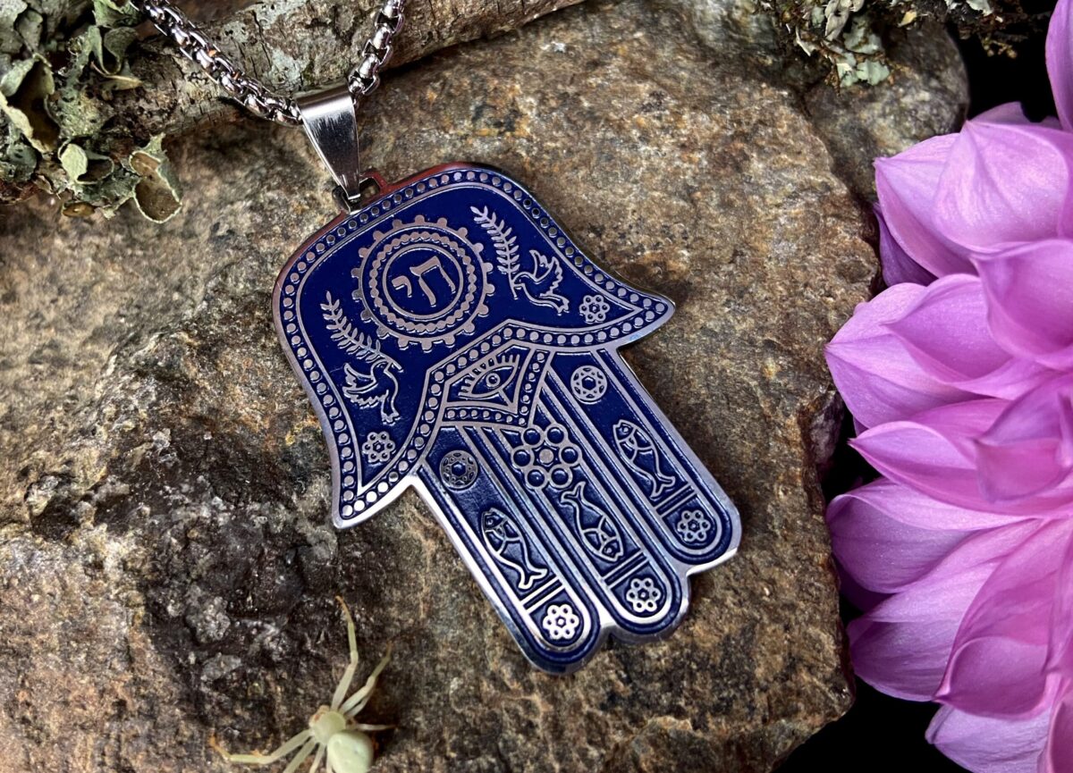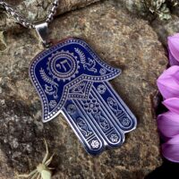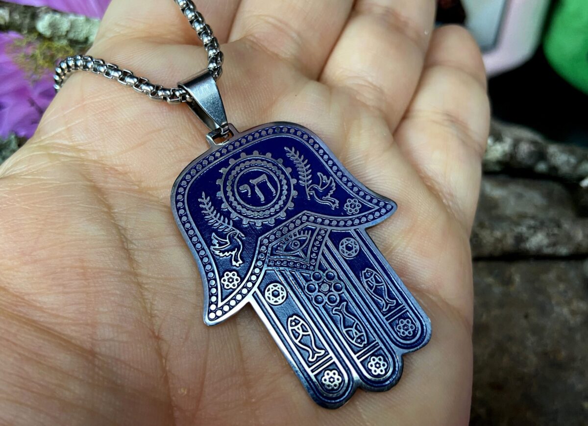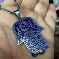 Pingente e corrente em Inox representando o amuleto Hansá, com detalhes na cor azul.