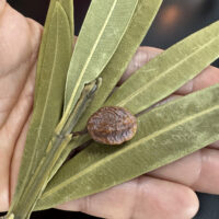 A fotografia é original do produto. As folhas inteiras aparecem apenas para mostrar as características da espécie, que se diferencia da oliveira europeia por apresentar folhas maiores e textura distinta. Este lote é composto somente por folhas, sem frutos.