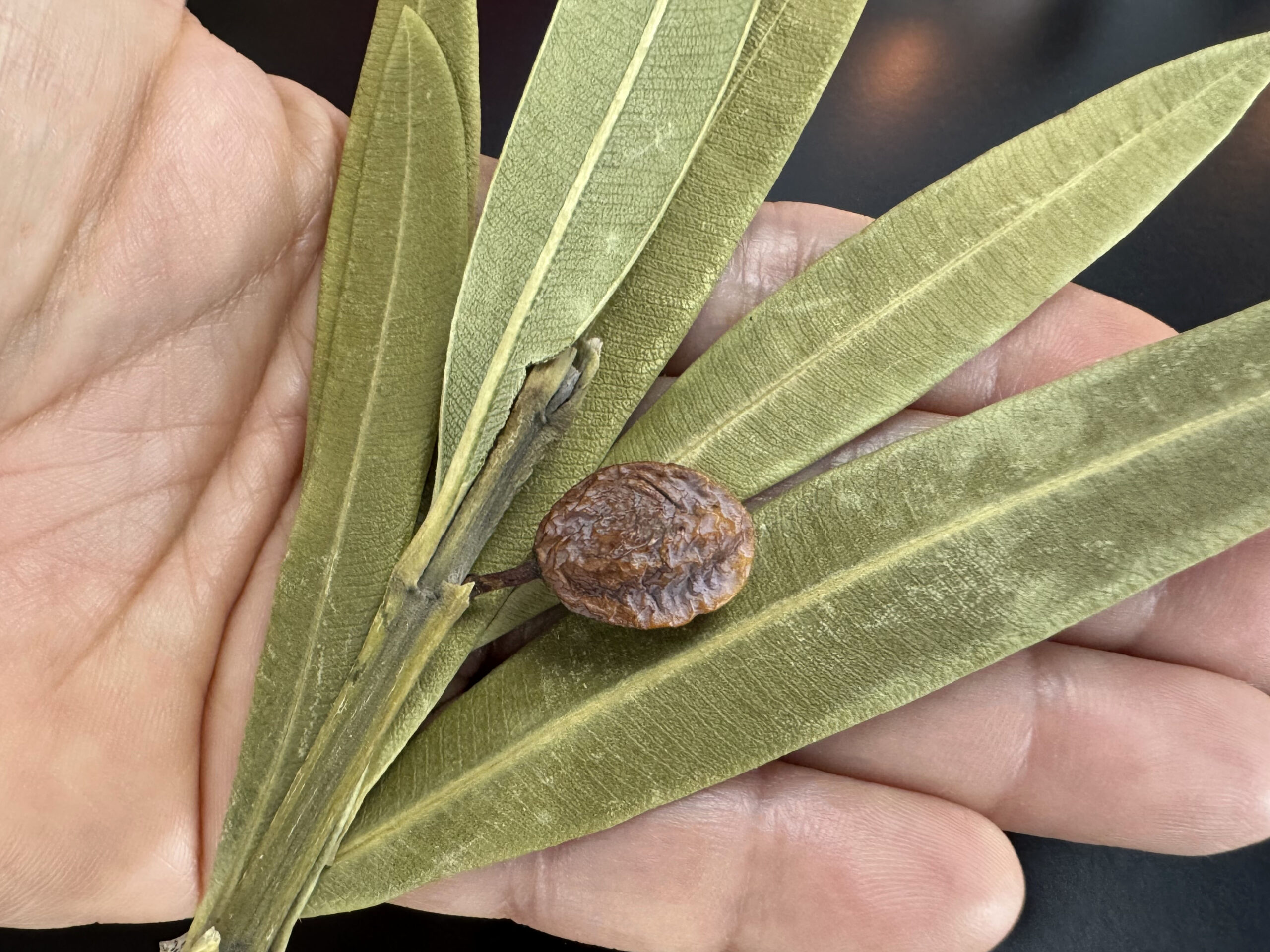 A fotografia é original do produto. As folhas inteiras aparecem apenas para mostrar as características da espécie, que se diferencia da oliveira europeia por apresentar folhas maiores e textura distinta. Este lote é composto somente por folhas, sem frutos.