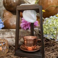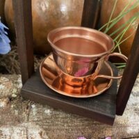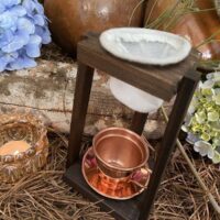 - Material: Mancebo de madeira, coador de tecido e xícara/pires de cobre