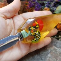 Esta é uma peça portuguesa da década de 50, com a figura de um galo em escultura no interior do cabo em resina translúcida.
